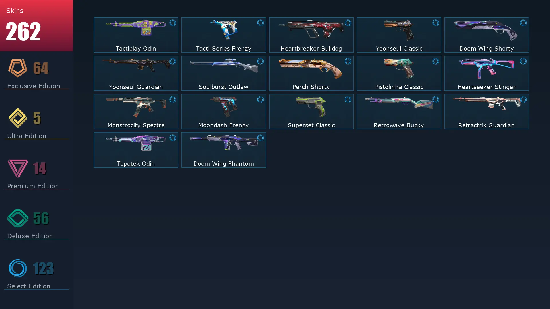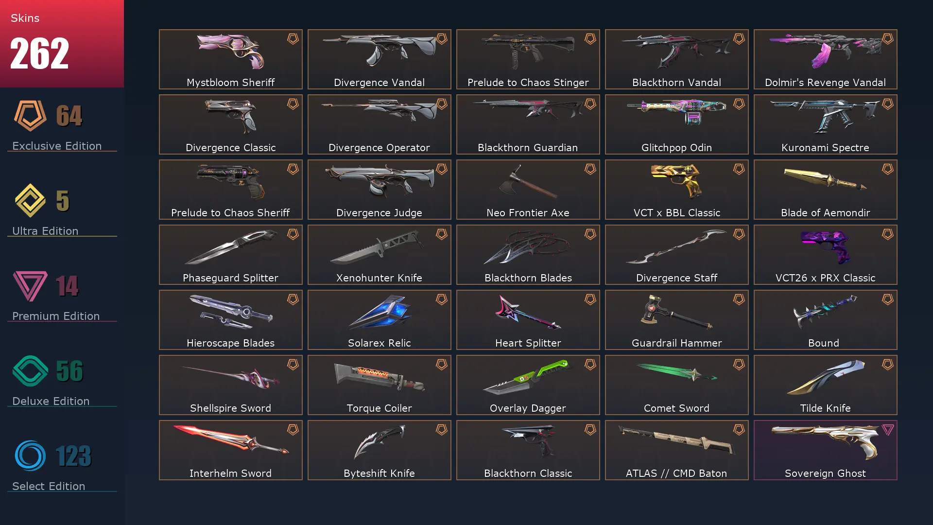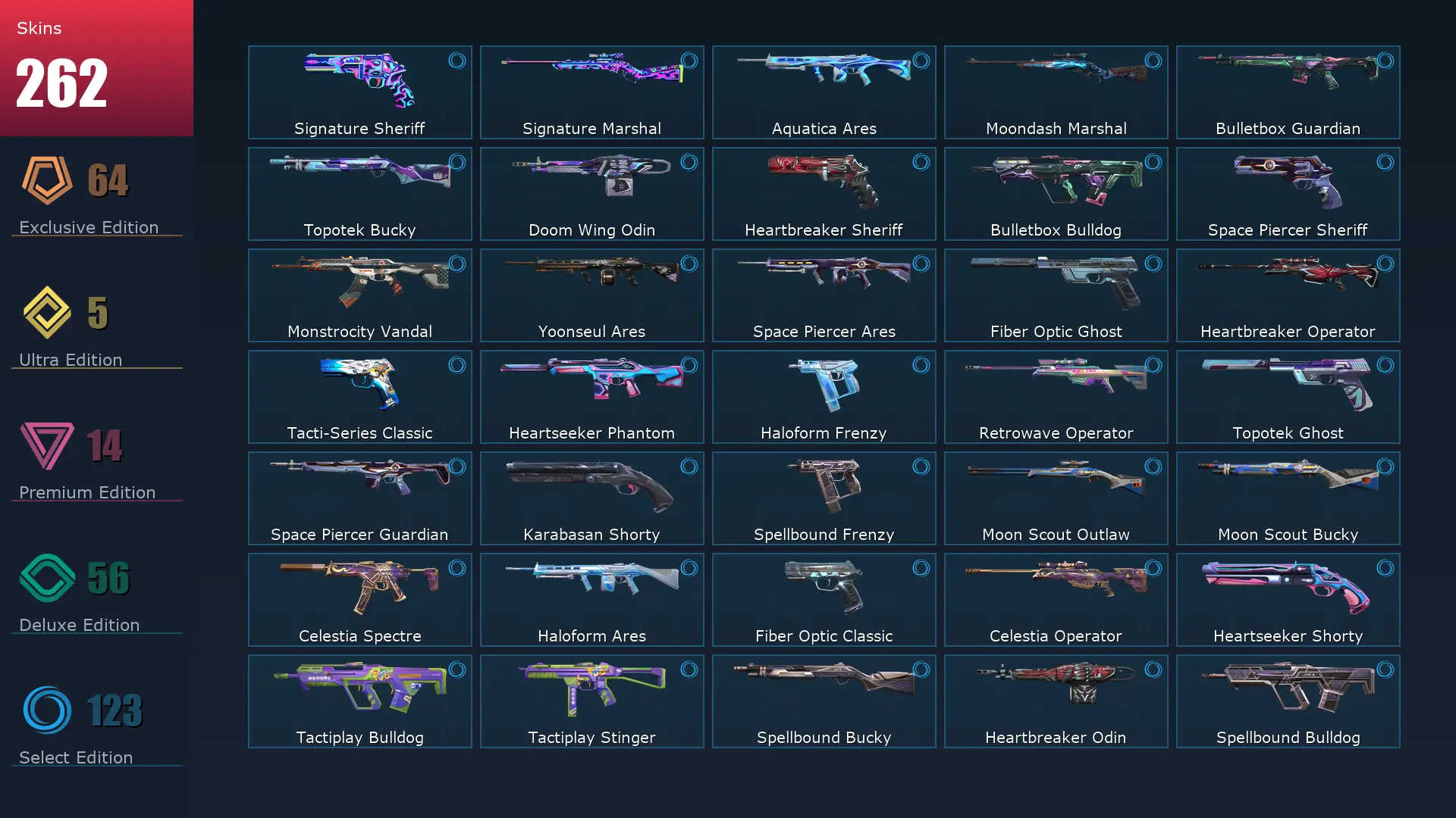 EU ๐ 262 Skins ๐ค Platinum 2 ๐ฅ 29 Agents ๐ฎ 280 Level ๐ Champions 2023 Vandal ๐ Champions 2025 Vandal ๐ซง Arcane Vandal ๐ฏ Champions 2025 Butterfly Knife ๐ฆฎ Neo Frontier Axe ๐ช Magepunk Sparkswitch ๐ฆ Glitchpop Vandal ๐ Phaseguard Ghost