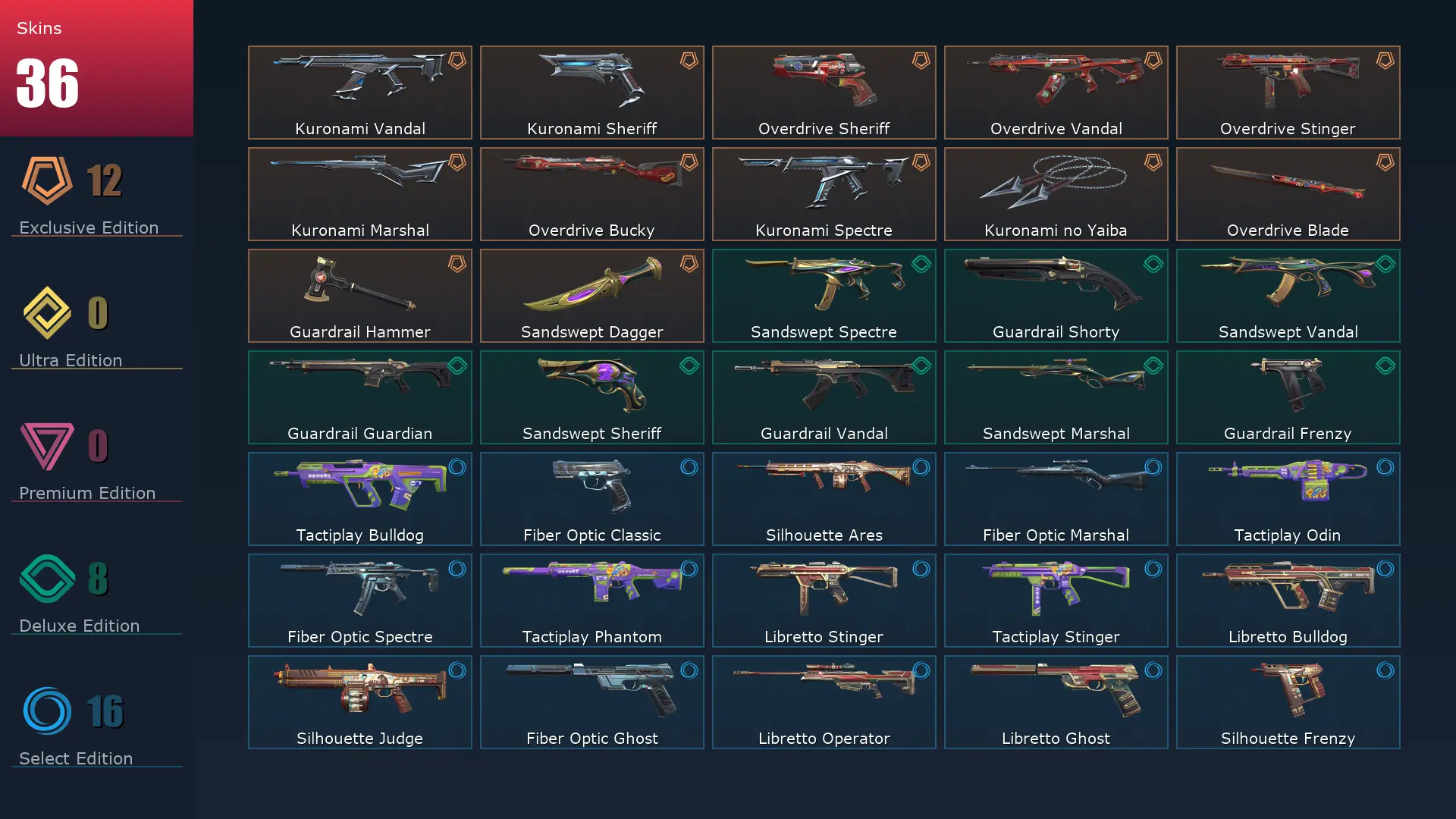 EU ๐ 36 Skins ๐ 20 Agents ๐ 82 Level ๐ Overdrive Sheriff ๐ฎ Kuronami Vandal ๐ฅ Kuronami Sheriff ๐ฆ Overdrive Blade ๐พ Overdrive Stinger ๐ธ Overdrive Bucky ๐ช Kuronami Marshal ๐ Kuronami Spectre ๐ Sandswept Spectre ๐ฆ Kuronami no Yaiba