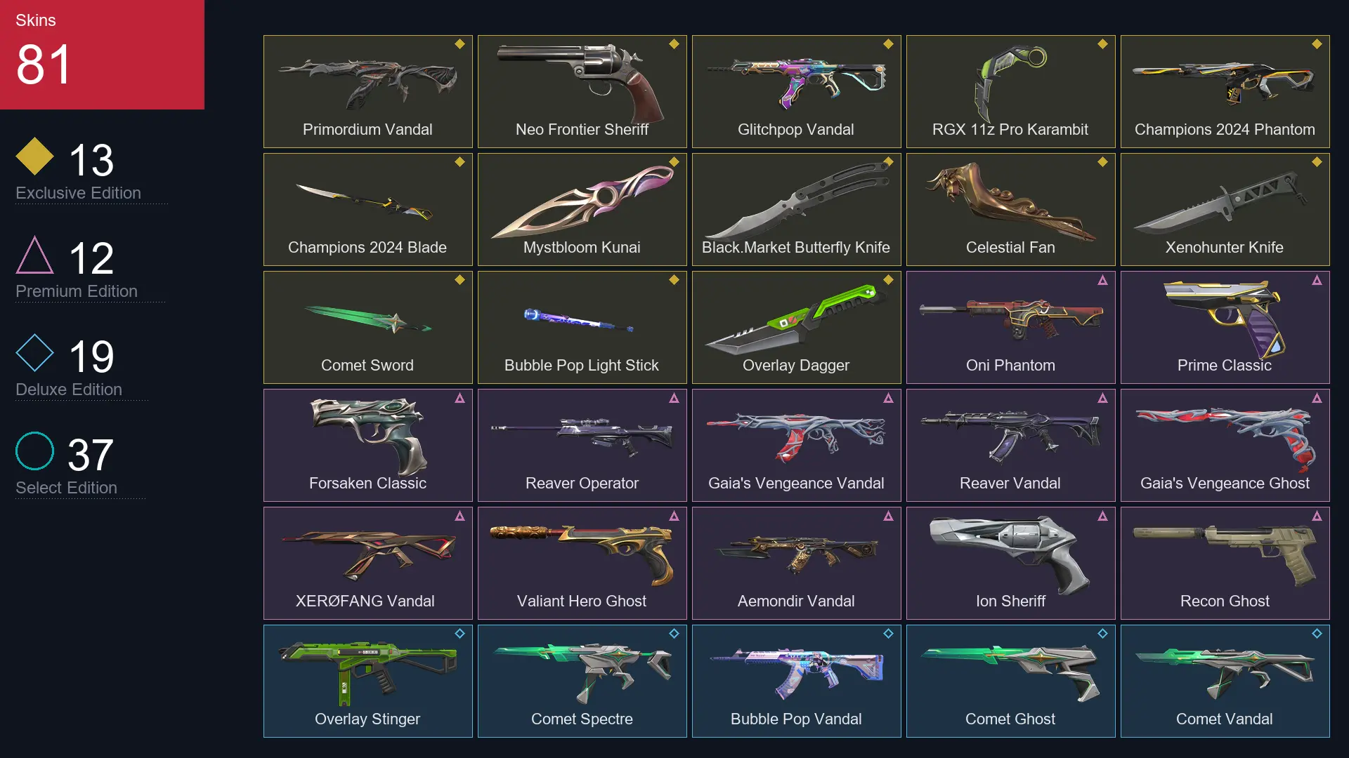 ๐ EU ๐ช 81 Skins ๐ 19 Agents ๐ 65 Level ๐ฒ ๐น Primordium Vandal ๐ฆ Oni Phantom ๐ธ Prime Classic ๐ฎ Forsaken Classic ๐ฒ Reaver Operator +76 more