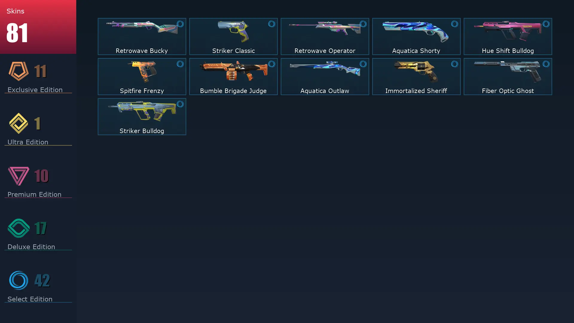 EU 🏅 81 Skins 🍠 28 Agents 🍟 238 Level 🎽 Coalition: Cobra Marshal 📍 Mystbloom Sheriff 🖨 Prime Spectre 🪂 Prime Vandal 📉 Neo Frontier Sheriff 🍣 RGX 11z Pro Karambit 🏆 XERØFANG Ghost 🥍 Reaver Phantom 🦩 Overdrive Vandal 🌂 Hue Shift Spectre