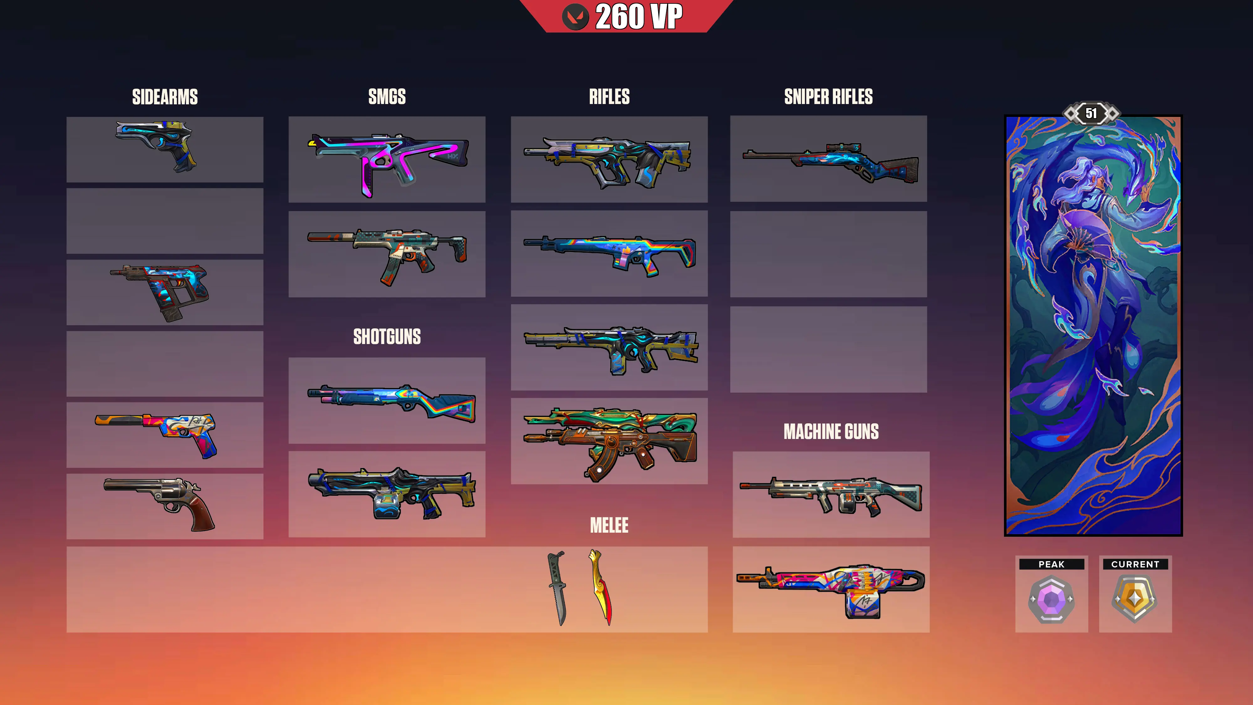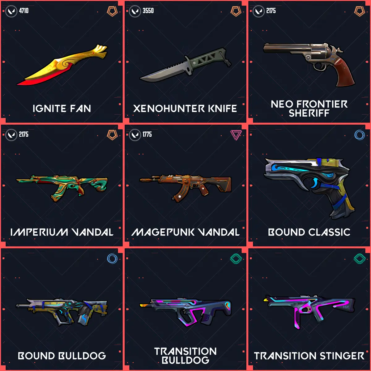 EU ⸱ 🎖️ Ignite Fan Collection ⸱ Xenohunter Knife ⸱ Imperium Vandal ⸱ Magepunk Vandal ⸱ Neo Frontier Sheriff ⸱ ⬆️ Peak Diamond 2 ⸱ 🔫 26 Skins ⸱ 🎟️ 2x Battlepass ⸱ 💰 260 VP ⸱ 📝 Check Description
