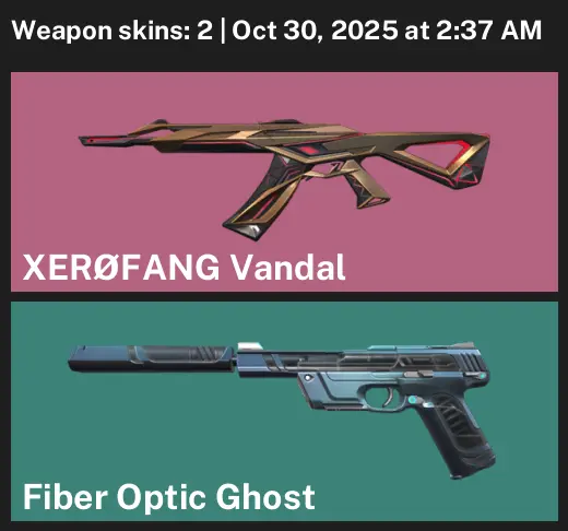 😷 EU ☝️ Unranked 🗻 2 Skins 🪛 275 VP 🛺 13 Agents 👊 Value: 1775 VP 🦊 XERØFANG Vandal ⛱ Fiber Optic Ghost