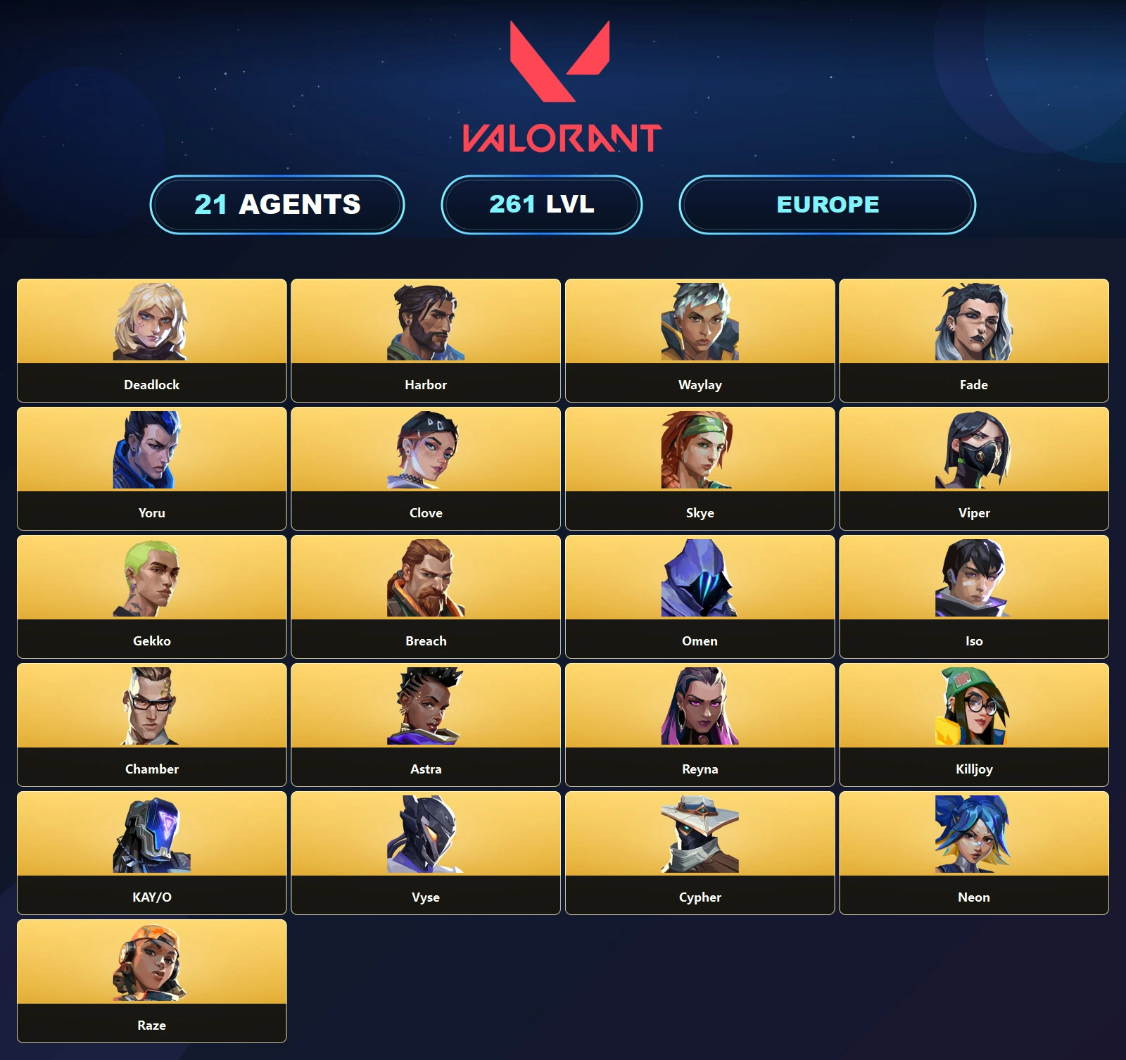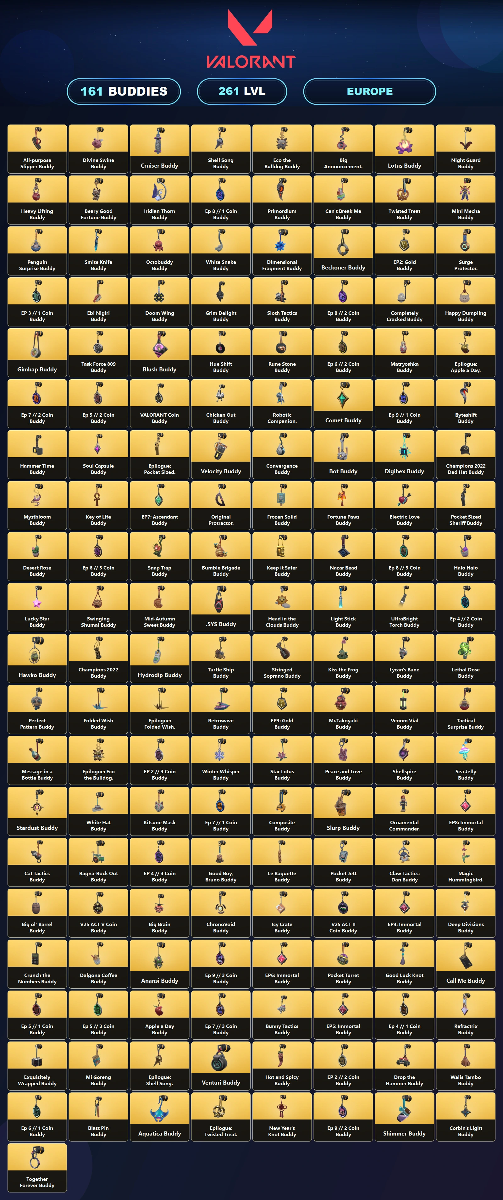 EU ๐ช 219 Skins ๐ค 261 Level โฑ Champions 2022 Phantom ๐ข Champions 2022 Butterfly Knife ๐ฏ Kuronami Vandal ๐ Elderflame Vandal ๐ Reaver Vandal ๐ง Reaver Phantom ๐ Prime Vandal ๐ช Unranked ๐ฅ 21 Agents