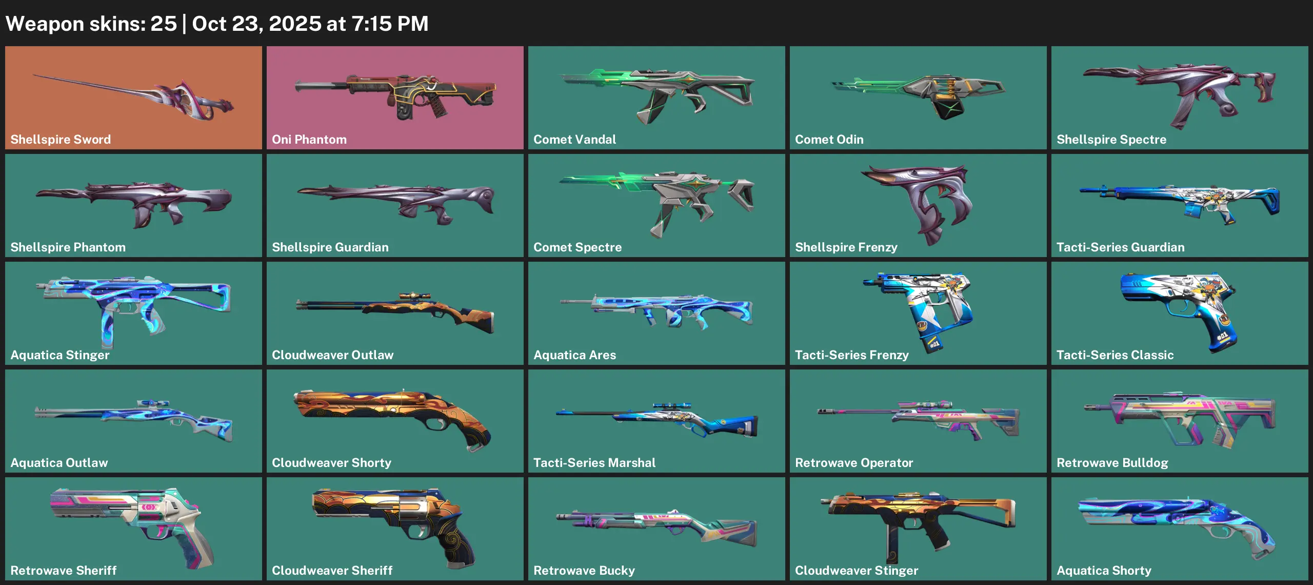😥 EU ⛅️ Unranked 🙊 25 Skins 🌈 125 VP ☀️ 17 Agents 🥝 Value: 1775 VP 🦝 Shellspire Sword 👺 Oni Phantom 🍛 Comet Vandal 🦊 Comet Odin 💊 Shellspire Spectre 🦙 Shellspire Phantom