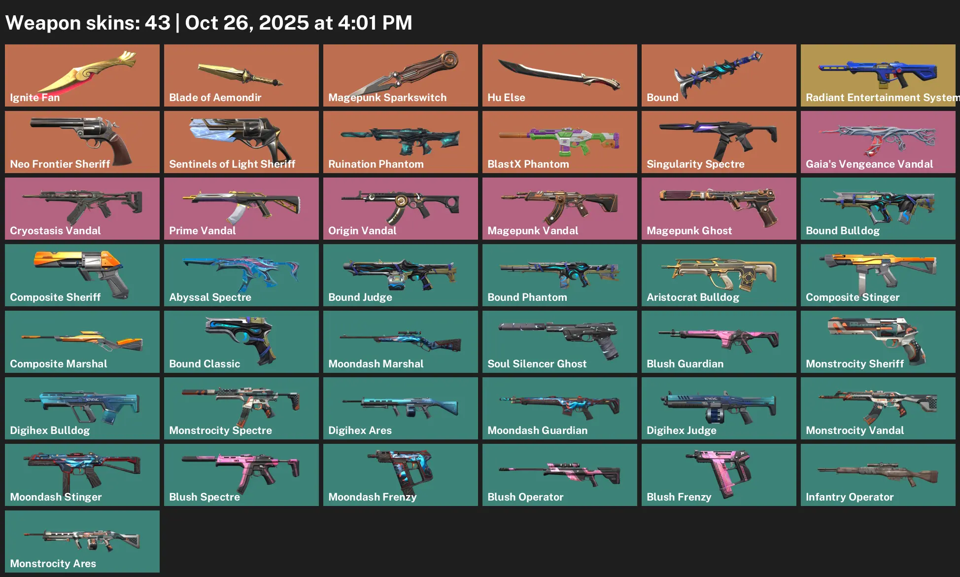 📻 EU 🍞 Unranked 🍐 43 Skins 🫛 36 VP 💼 5 Agents ⛴ Value: 38375 VP ☔️ Ignite Fan 💩 Blade of Aemondir 😹 Magepunk Sparkswitch 🪞 Hu Else 🙈 Bound 🍸 Radiant Entertainment System Phantom