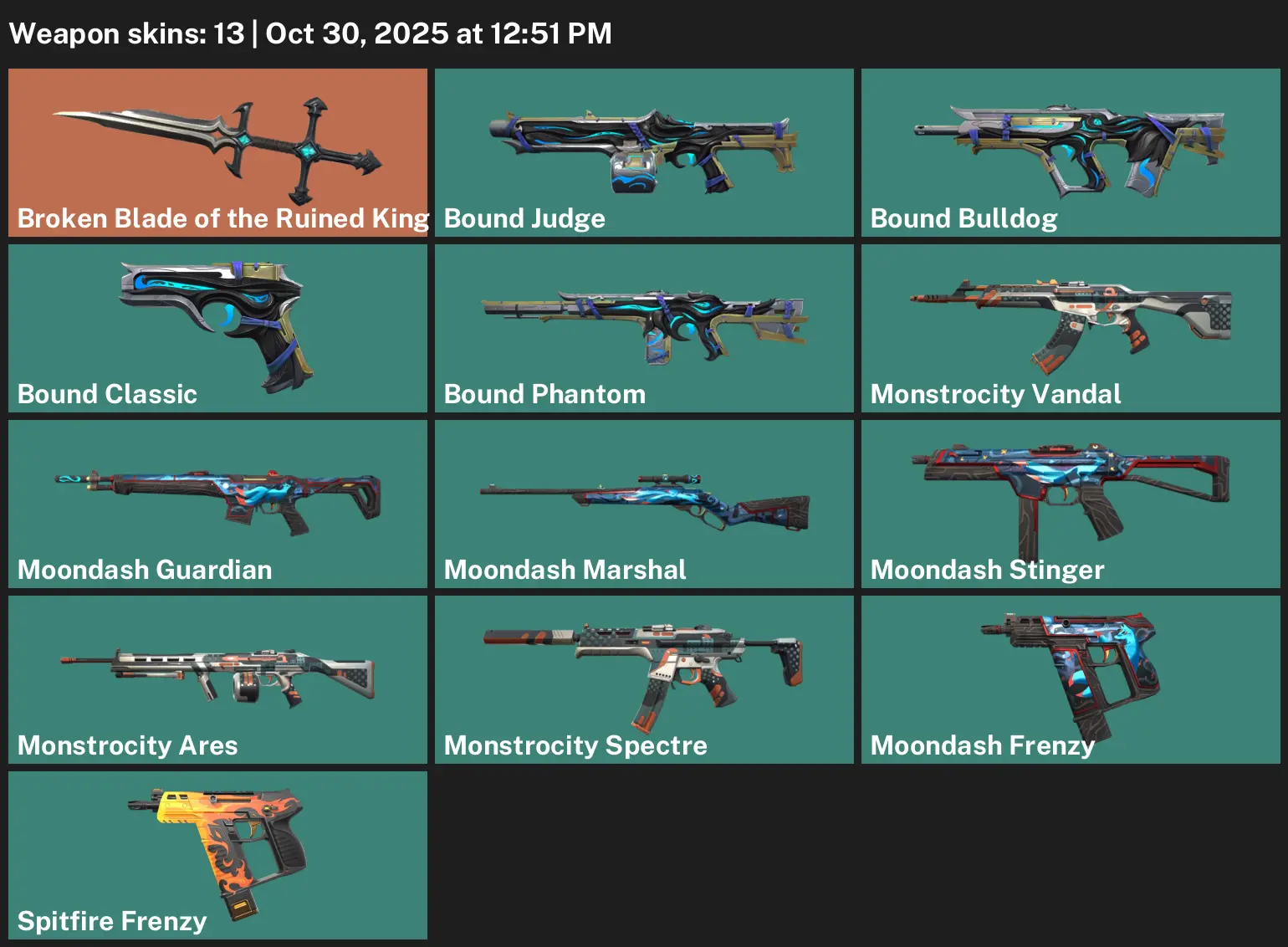😂 LA 🐒 Unranked 🐐 13 Skins 🛋 1100 VP 🗓 17 Agents 🦏 Value: 4350 VP 👉 Broken Blade of the Ruined King 🫎 Bound Judge 🙁 Bound Bulldog ⏲ Bound Classic 🚌 Bound Phantom 🥼 Monstrocity Vandal