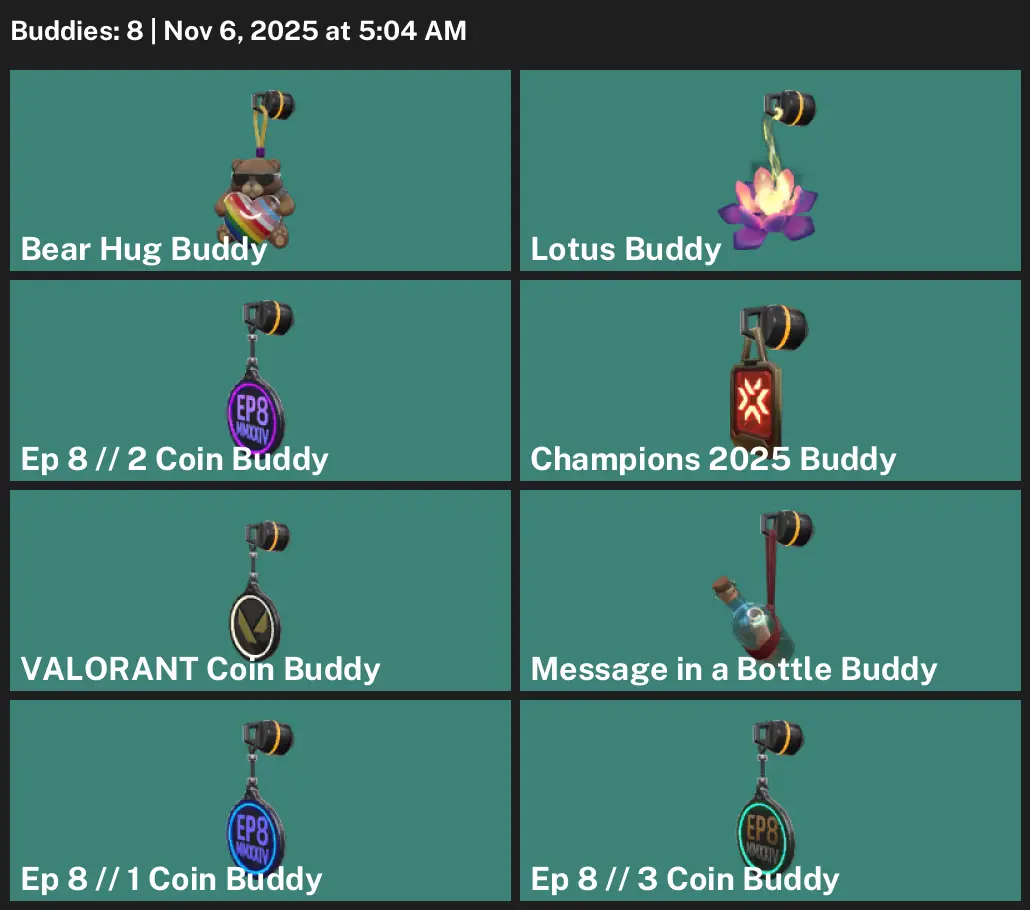 👝 NA 🏨 Unranked 🐁 2 Skins 🏖 0 VP 🦠 5 Agents 🧦 Value: 8025 VP 🔏 Champions 2025 Vandal 🧢 Champions 2025 Butterfly Knife
