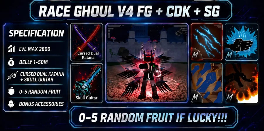 GHOUL V4 🧬 FULL GEAR 💫 CDK 💥 SG 🧣 2800 LVL ⚙️ GOD HUMAN 🧣 1-15 FRUITS ♨️ Weapons + Other Things + Full Access ⚡ INSTANT DELIVERY