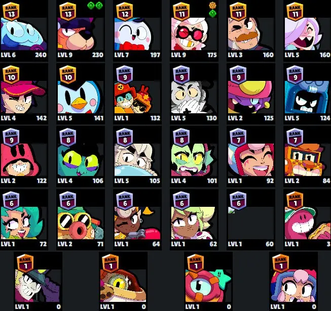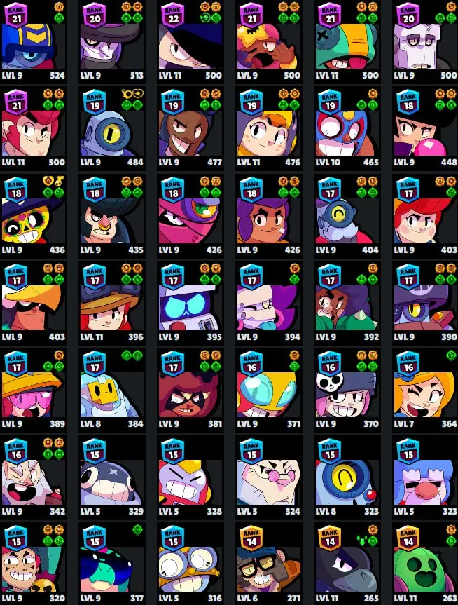👑 70 Brawlers 👑 19.665 Trophies 👑 57 Skins 👑 6 Legends 👑 20 Mythics 👑 25 Epics 👑 1550 Gold 👑 24 Gems 👑 142 Blings 👑