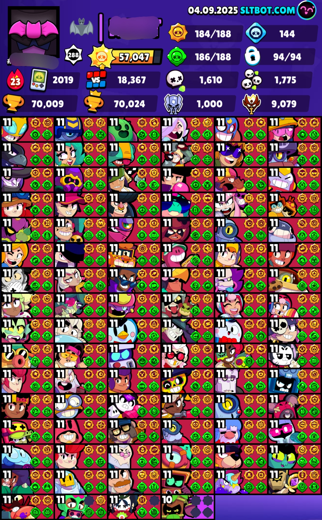 *70k Trophies* 🏆 93/94 Brawlers Max 💪 & 49 Hypers ⚡ {184 Star Power 🌟 186 Gadgets Unlock 🛠️} Highest Masters Rank 🥇 305 Skins 🎭 CH301