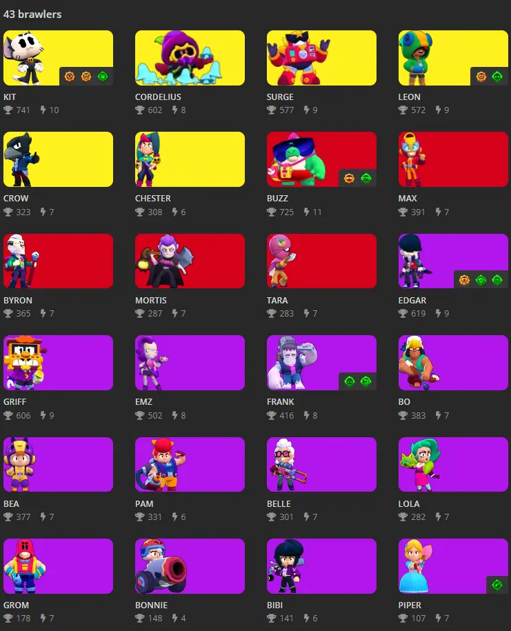 Brawl Stars : 43 Brawlers : 6 Legends : KIT ; CORDELIUS ; SURGE ; LEON ; CROW ; CHESTER