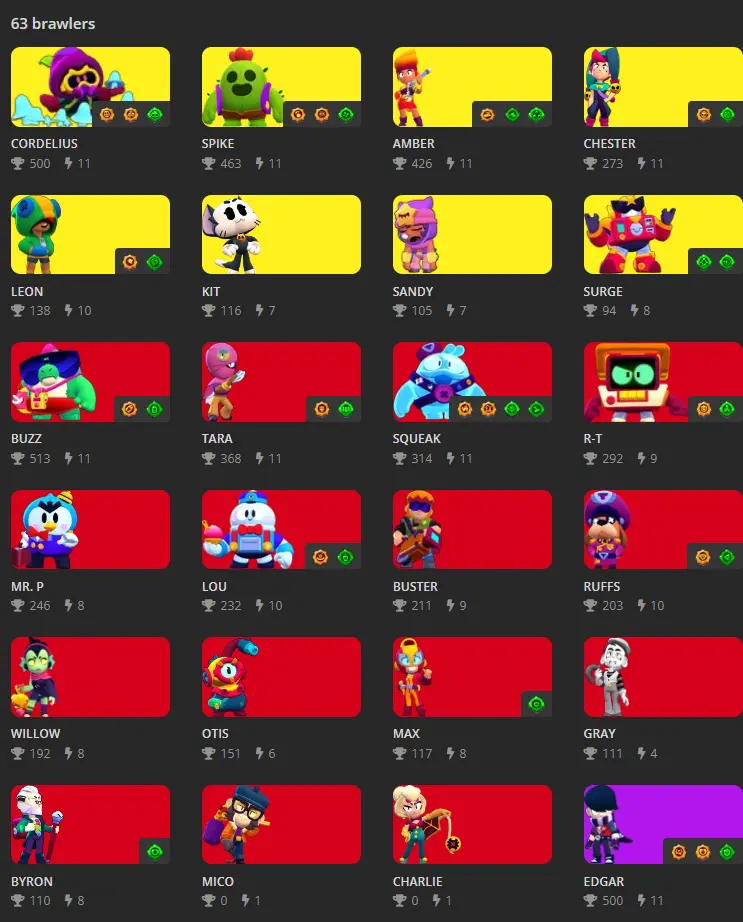 Brawl Stars : 63 Brawlers : 8 Legends : CORDELIUS ; SPIKE ; AMBER ; CHESTER ; LEON ; KIT ; SANDY ; SURGE