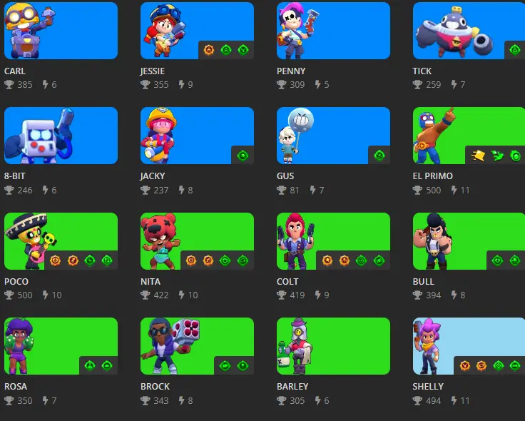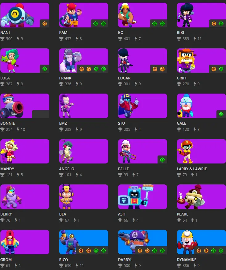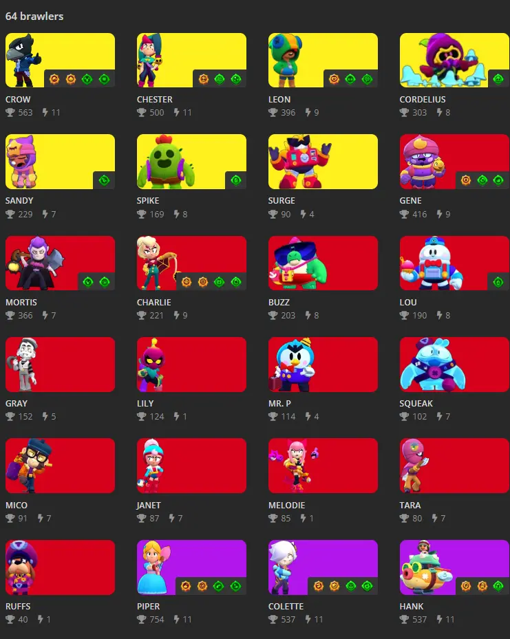 Brawl Stars : 64 Brawlers : 7 Legends : CROW ; CHESTER ; LEON ; CORDELIUS ; SANDY ; SPIKE ; SURGE