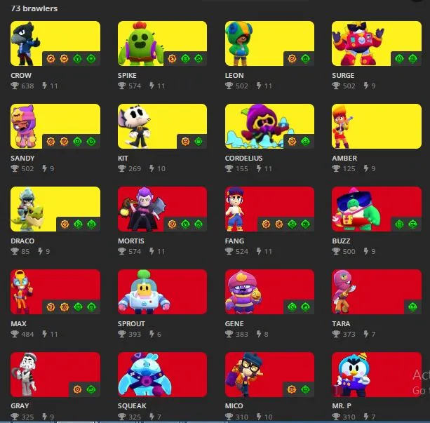 Brawl Stars : 73 Brawlers : 9 Legends : CROW ; SPIKE ; LEON ; SURGE ; SANDY; KIT ; CORDELIUS ; AMBER ; DRACO