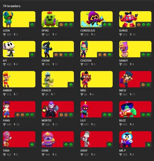 Brawl Stars : 74 Brawlers : 11 Legends : LEON ; SPIKE ; CORDELIUS ; SURGE ; KIT ; CROW ; CHESTER ; SANDY ; AMBER ; DRACO ; MEG