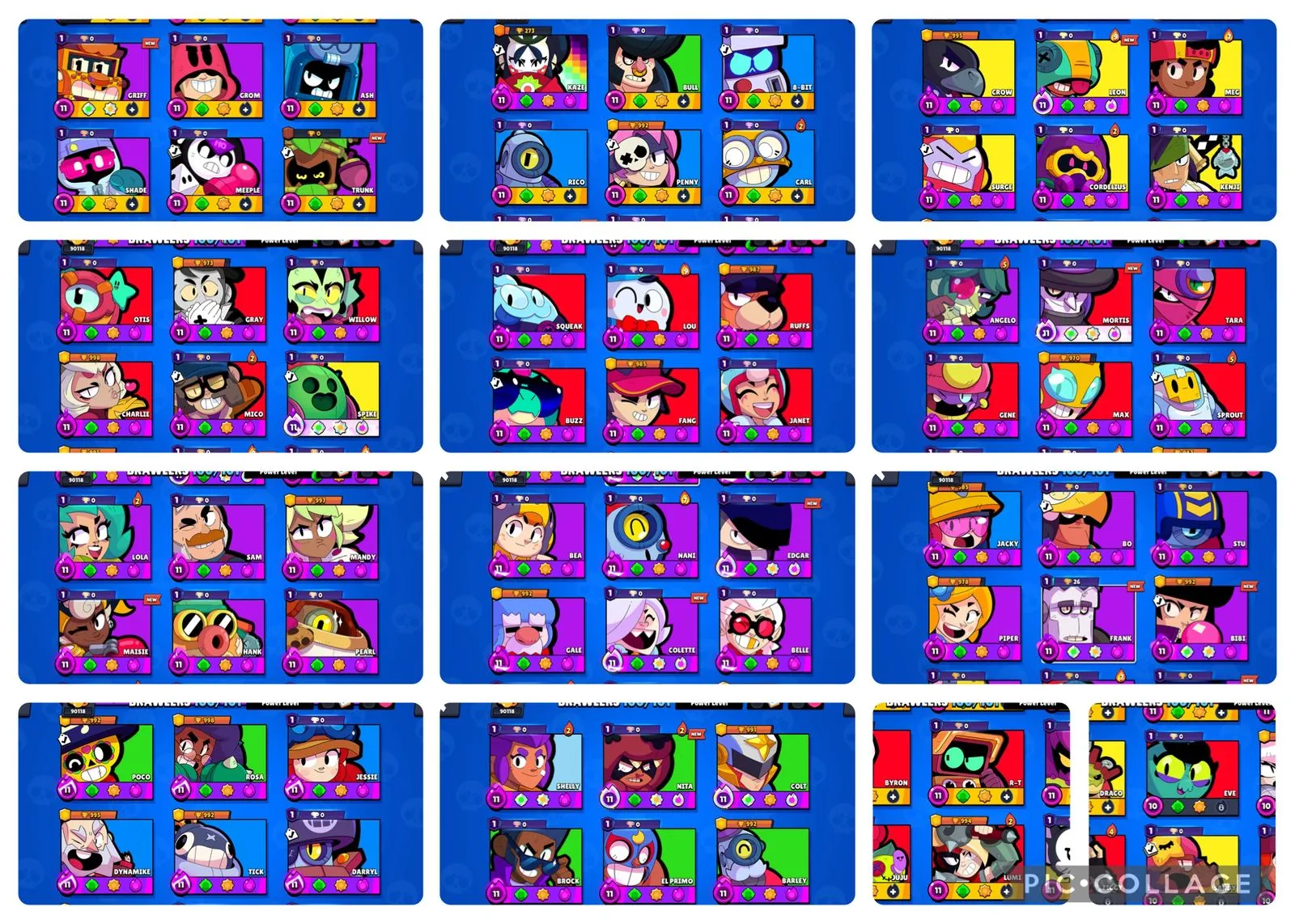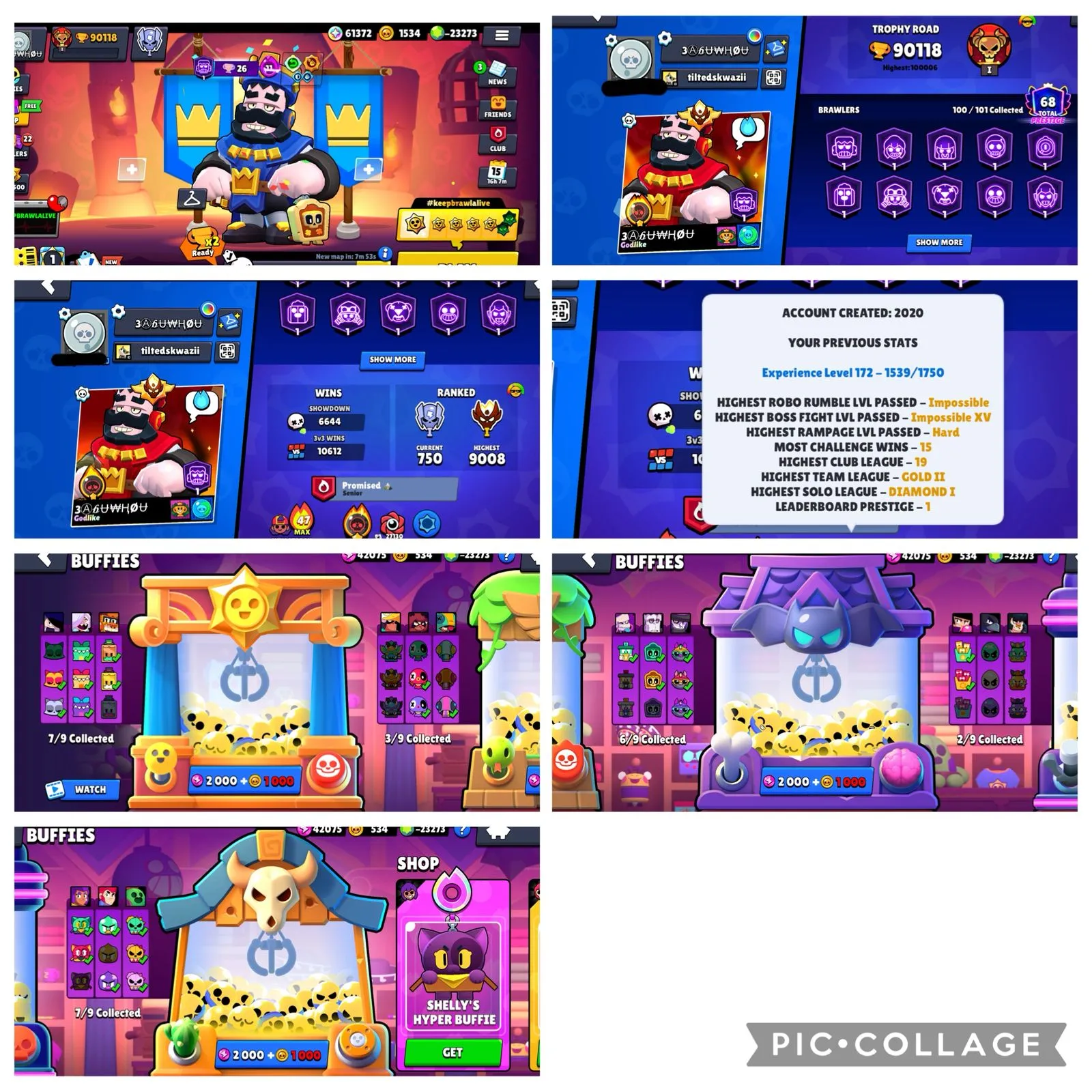 OG 2020, BLUE & RED KING FRANK, MASTERS, 1 LEADER BOARD PRESTIGE, METEORIC FAME 1, 90k+ TROPHY, 486 SKINS, 73 MAX & 55 HYPER, 25 BUFFIES, 68 PRESTIGE, 101 BRAWLERS, 1558 PINS, NEGATIVE GEMS, VB34