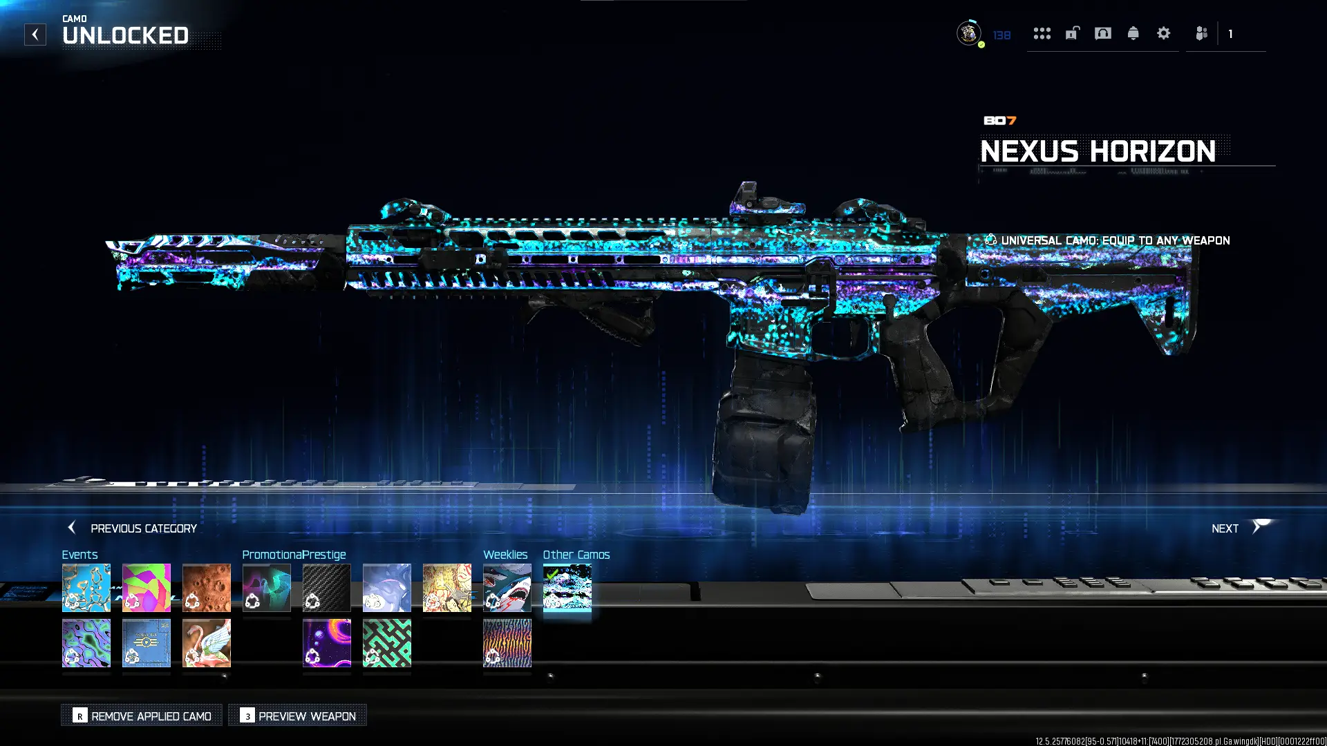 🔥 BO7 🔥 Nexus Horizon ✨ Prestige Master 🧪 Singularity ☣️ Infestation 💥 Apocalypse 🍃 Genesis 🎭 1800+ Camos 🎯 Many Universal Camos 🔥 All Guns Maxed 🔓 Full Access 🌐 Steam / Battle.net / PSN / Xbox BO7