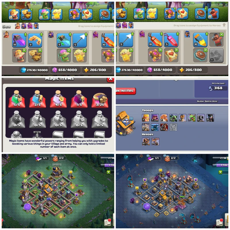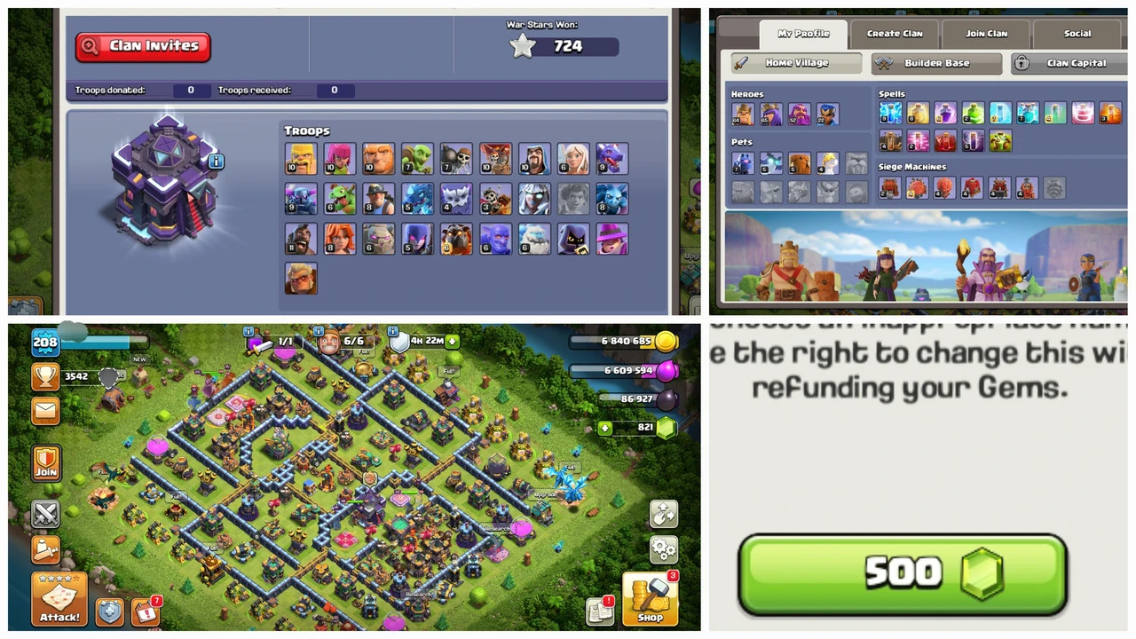 TH 15 Good Defence & Troops 🔥 Level 208 🗡️ Heroes 64_65_52_22 💫 Gems 821 🧍♂️ 6 Worker 🎯 Nc 500 Gems (Android &iOS) 💵 M1372