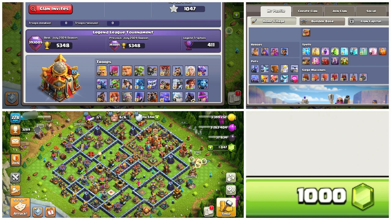 TH 16 Semi Max 🏆 Level 228 🧙♂️ Heroes 65_70_70_30 🔥 Gems 1047 🧱 1 Epic equipment 🏯 6 Skin 🧩 Nc 1000 Gems (Android &iOS) 🗡️ M1379