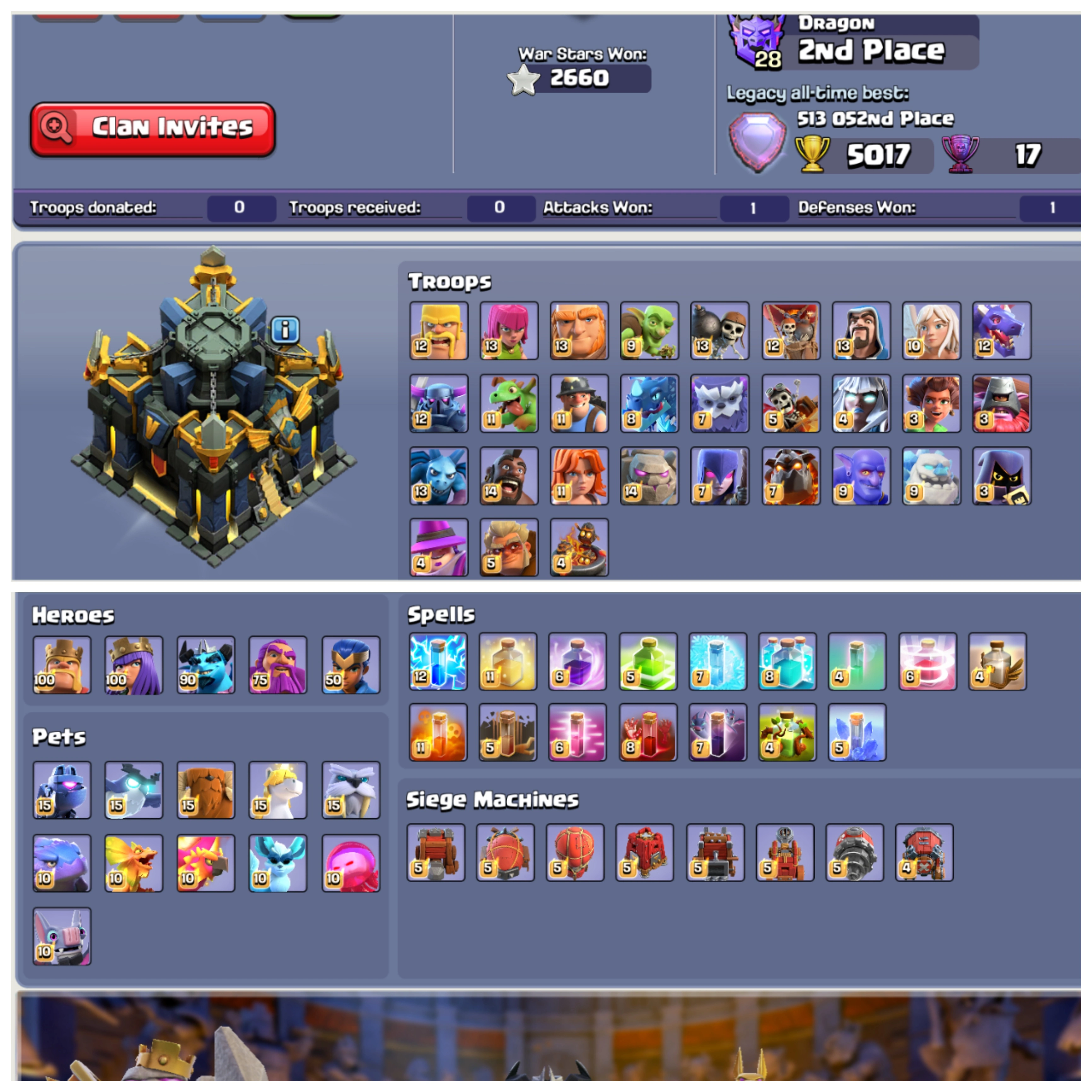 👑 TH 17 Final Boss 💥 Maxed Out 💎 9 Epic Equipments 🧱 24 Max Equipments ⚽ Football Scenary 🎨 16 Skins 🧠 Full Max Laboratory & BuilderHall 🚀 Instant Delivery