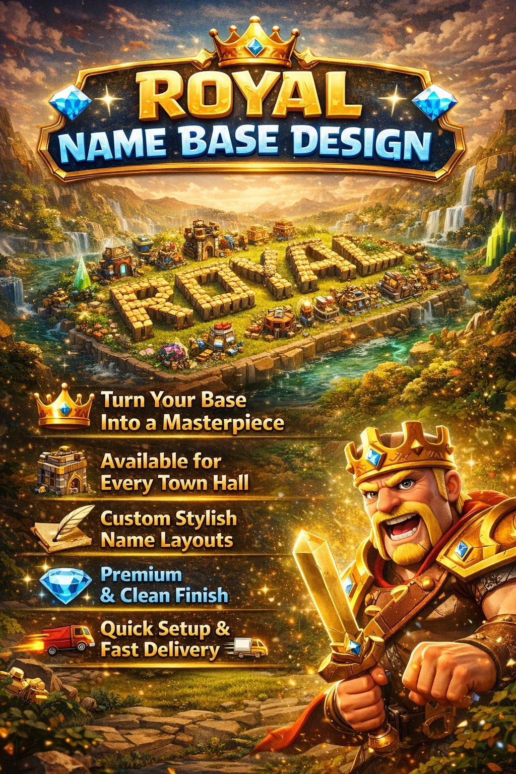 クラクラ(Clash of Clans)の名前ベースをきちんとデザインするのは、思っているより簡単ではありません。クラクラの村にオリジナルの文字を配置するには、文字の形を計画し、壁の数の制限に合わせ調整し、全体のレイアウトが機能するベースに見えるようにする必要があります。だからこそ、多くのプレイヤーは自分で何時間もかけて作るよりも、名前ベースのデザインを購入することを選んでいます。