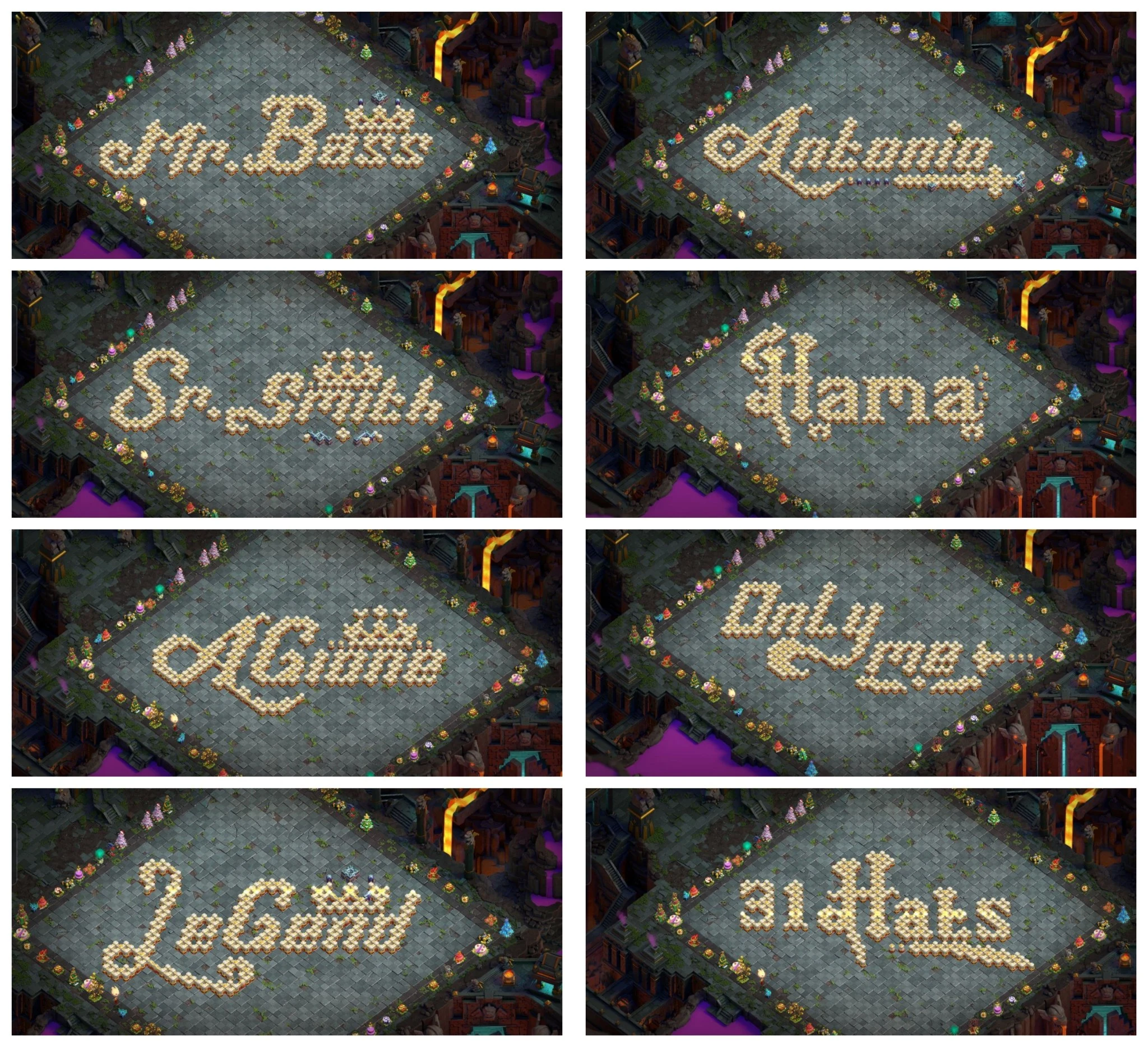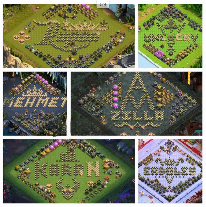 クラクラの壁は防御目的で使われますが、プレイヤーたちはその枠を超えたクリエイティブな使い方を見つけました。壁はグリッド上に1つずつ設置されるため、村全体を上から見たときに文字や名前、言葉を形作るように配置することができます。このような配置は「ネームベース」と呼ばれ、村を一種の自己表現の場へと変えます。