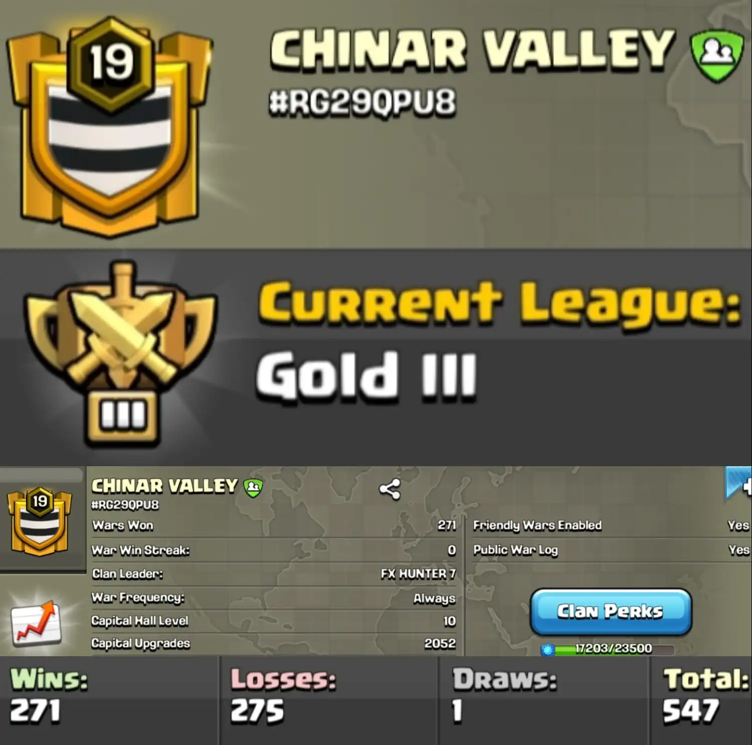 Level 19 clan || clan capital 10 || gold 3 || name - CHINAR VALLEY