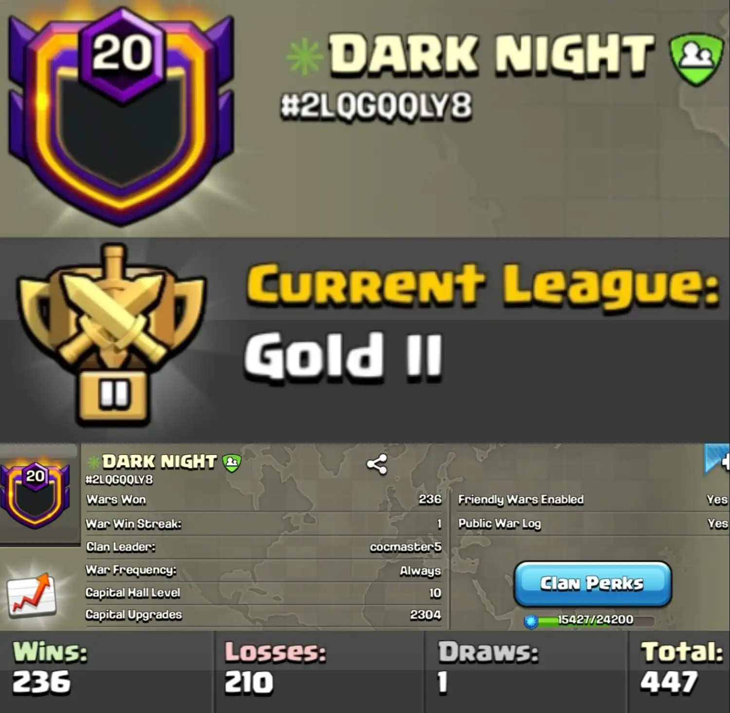 Level 20 clan || clan capital 10 || gold 2 || warlog 236-210 || name - DARK NIGHT