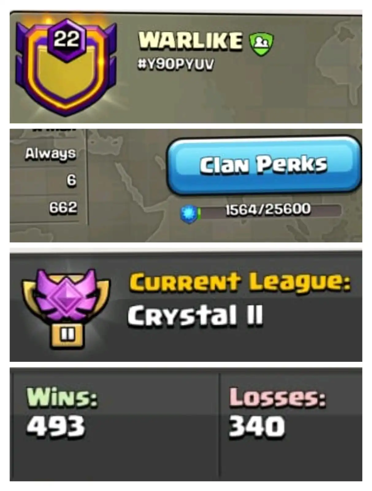 [] NAME:Brother's [] LEVEL:18 [] CAPITAL HALL:5 [] WAR WON: 239 / 89 [] CWL: CRESTAL 1