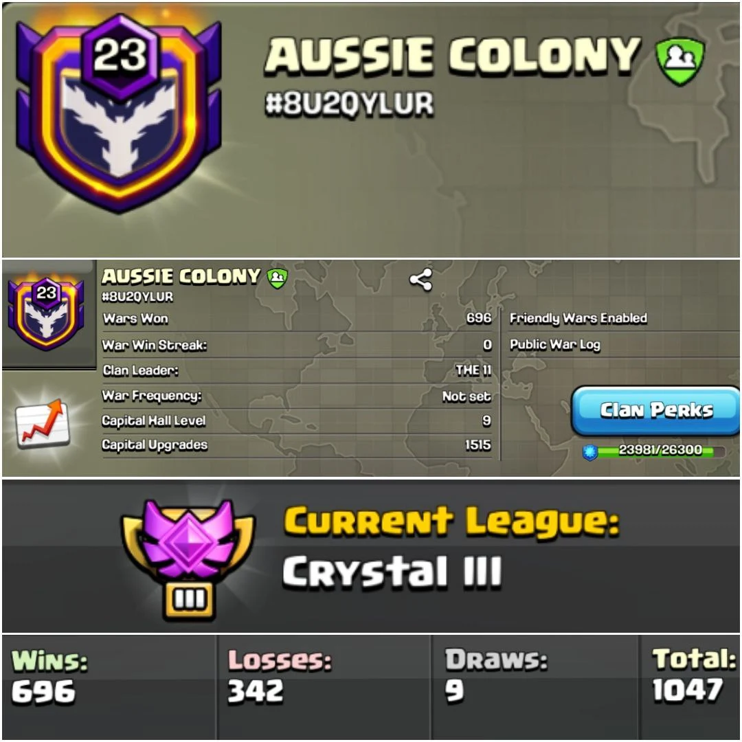 Level 23 | Name - AUSSIE COLONY | Clan Capital - 9 | Crystal League | Awesome Warlog | Fast Delivery