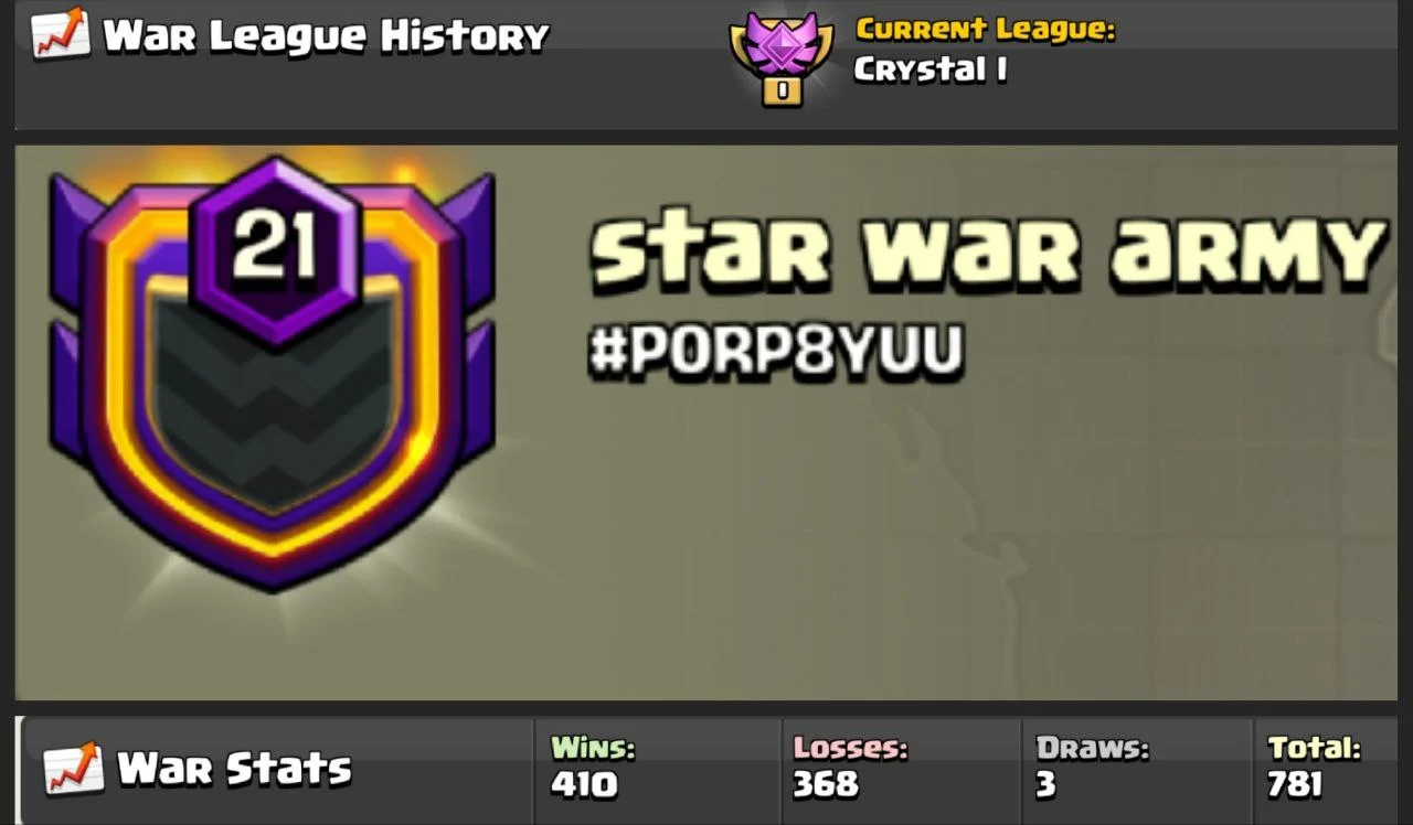 🚩 WAR LEGEND CLAN 🚩 | “STAR WAR ARMY” ⭐ | 410 VICTORIES ⚔️ | LVL 21 | GOOD STATS 📈 | CRYSTAL 1 🏆 | FAST DELIVERY ⚡