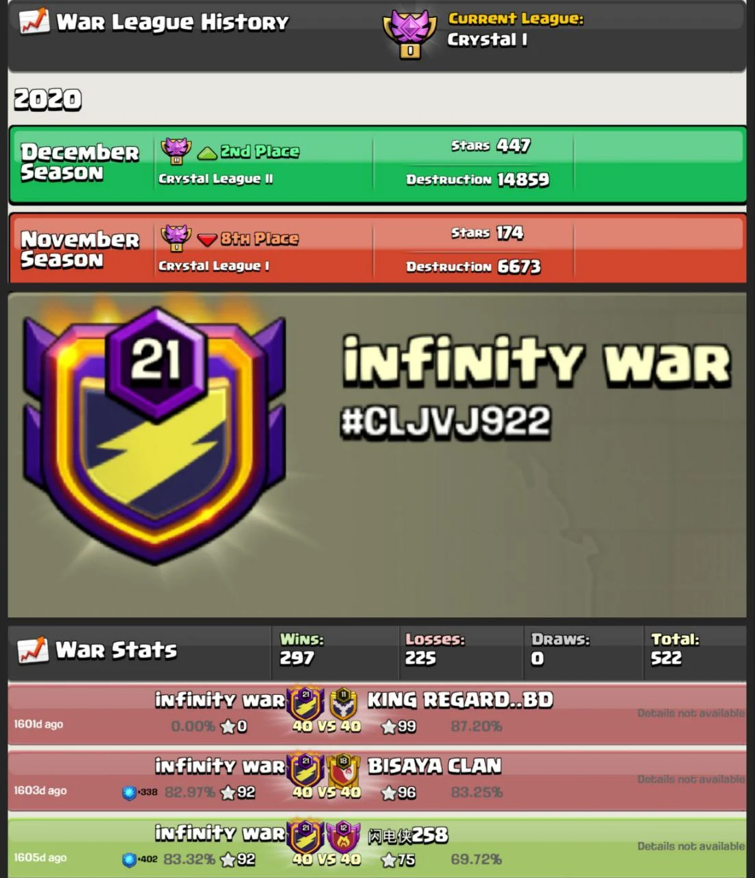 ♾️ INFINITY WAR ♾️ | LVL 21 CLAN 🛡️ | 297 WINS ⚔️ | CRYSTAL I 🏆 | ENG NAME 🇬🇧 | CHEAP 💸 | INSTANT DELIVERY 🚀
