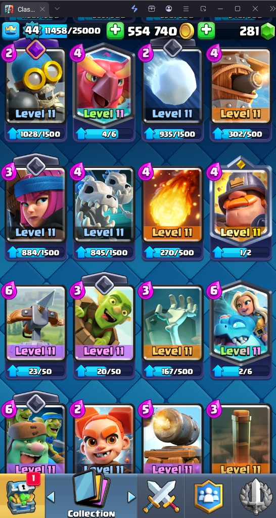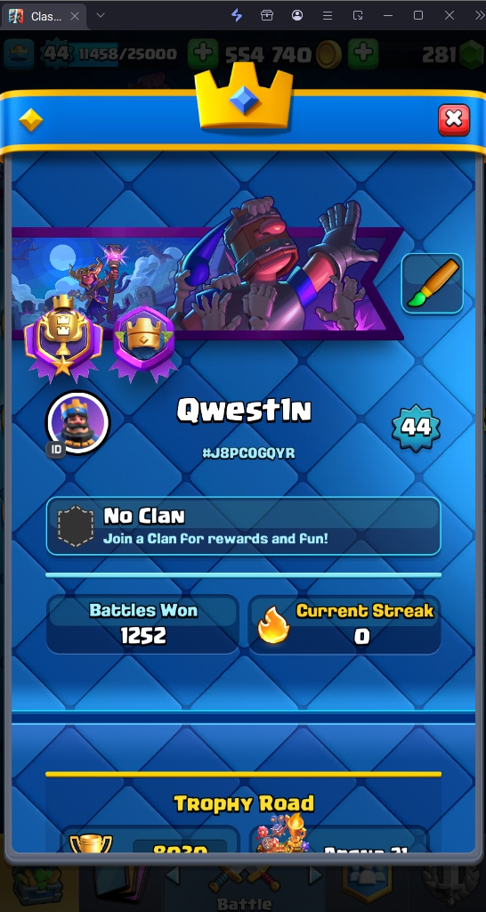 8030 TROPHY 🏆 44 LVL 💯 KT 14 👑 120 CARDS ♦️ 8 MAX CARDS 👑 1 ELITE CARDS  🔮 9 EVO 💯 EMOTE 58 🎭 #J8PC0GQYR ⸱ TAG ACCOUNT ♥️
