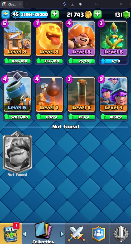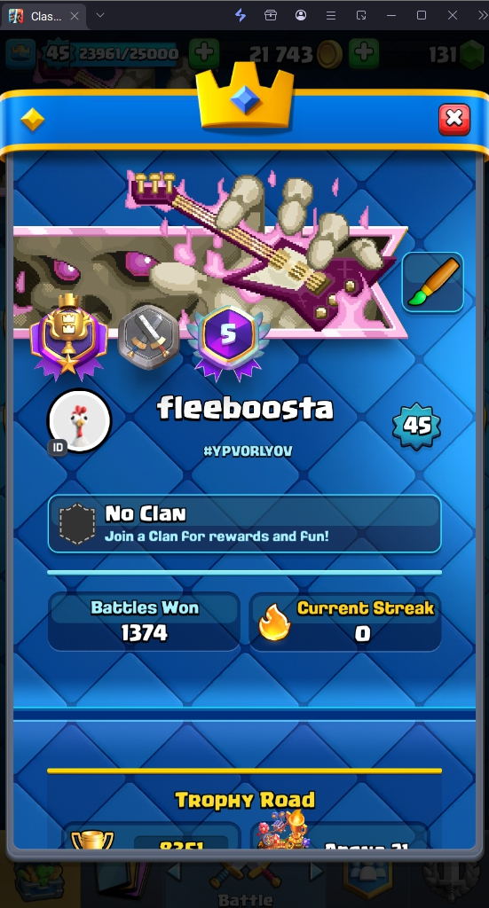 8351 TROPHY 🏆 45 LVL 💯 KT 14 👑 120 CARDS ♦️ 3 MAX CARDS 👑 1 ELITE CARDS 🔮 10 EVO 💯 EMOTE 60 🎭 #YPV0RLY0V ⸱ TAG ACCOUNT ♥️