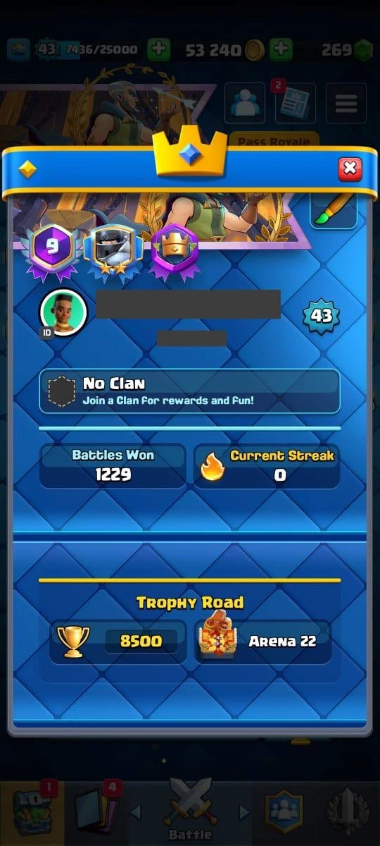 8500 Trophies | XP Lvl 43❗️| 3 MAXED CARDS❗️| 1 ELITE LEVEL CARD ❤️🔥| 8 EVOLUTIONS📈 | 25 EMOTES | 100% safe account | instant delivery