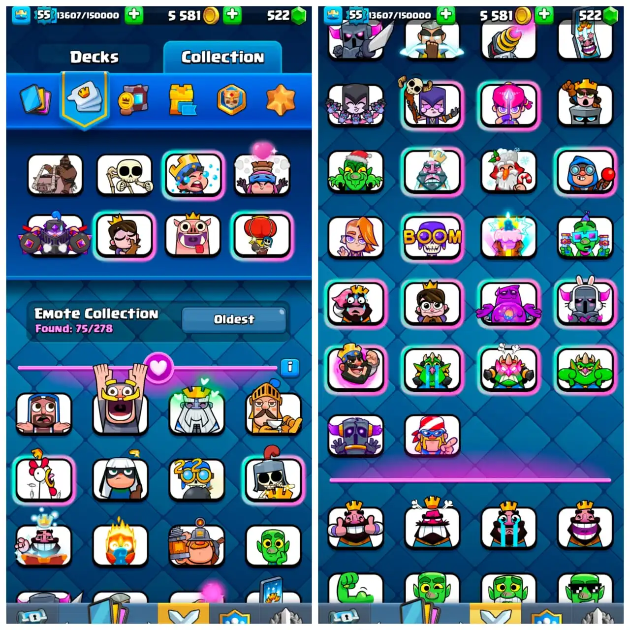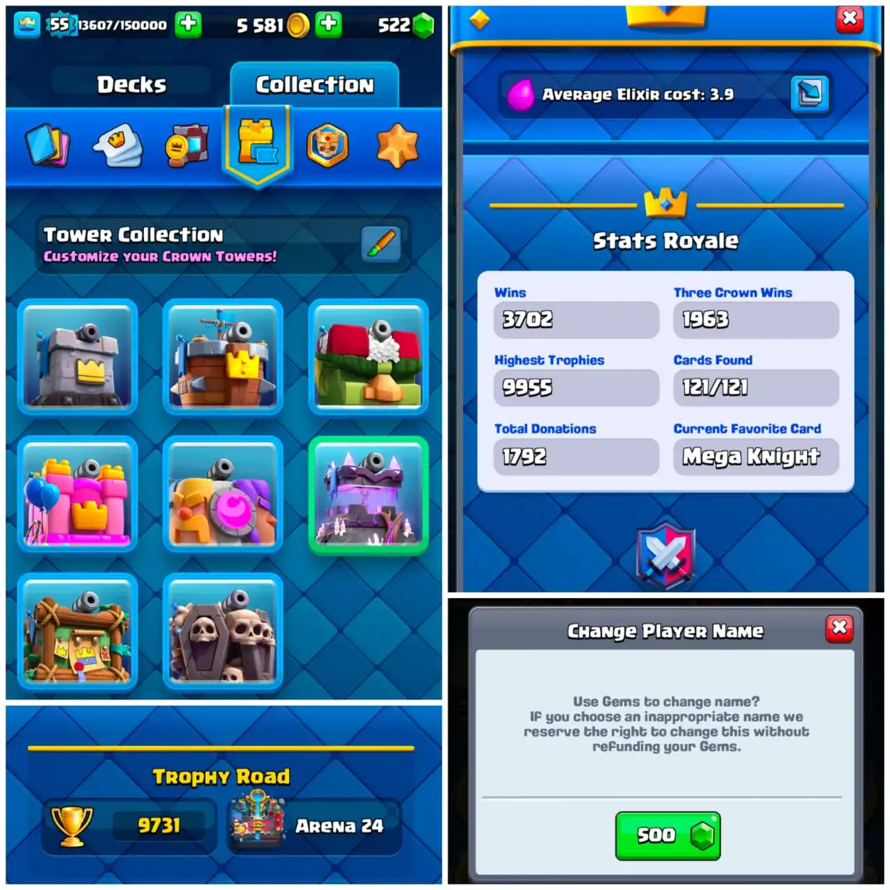 💥👑 Best Cr KT 15 🏹🎁 Lvl 55 🚀 14 Evo 🧬 level 14 cards- 22 ❤️🔥 Elites 7 🐲 75 Emotes 💫🪅 8 RAre Tower Skins💫 🔥 8 Year Badge 📛 522 Gems 🗼 Instant Delivery 🚚