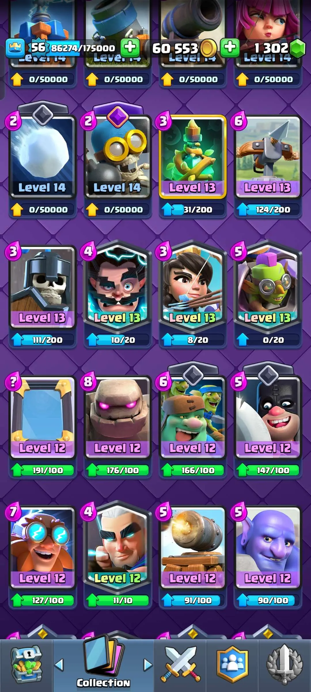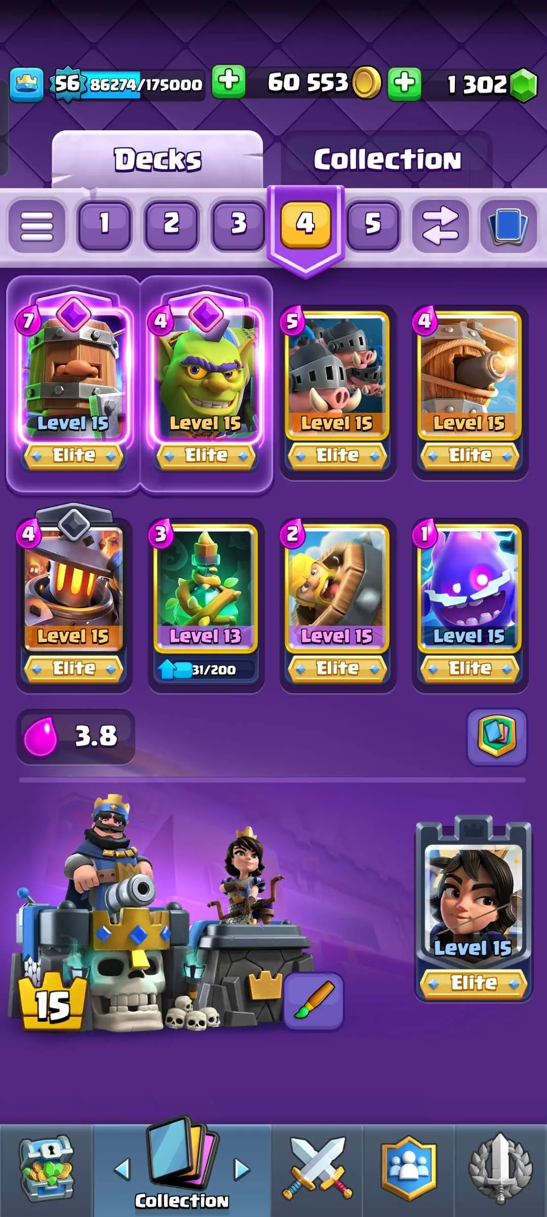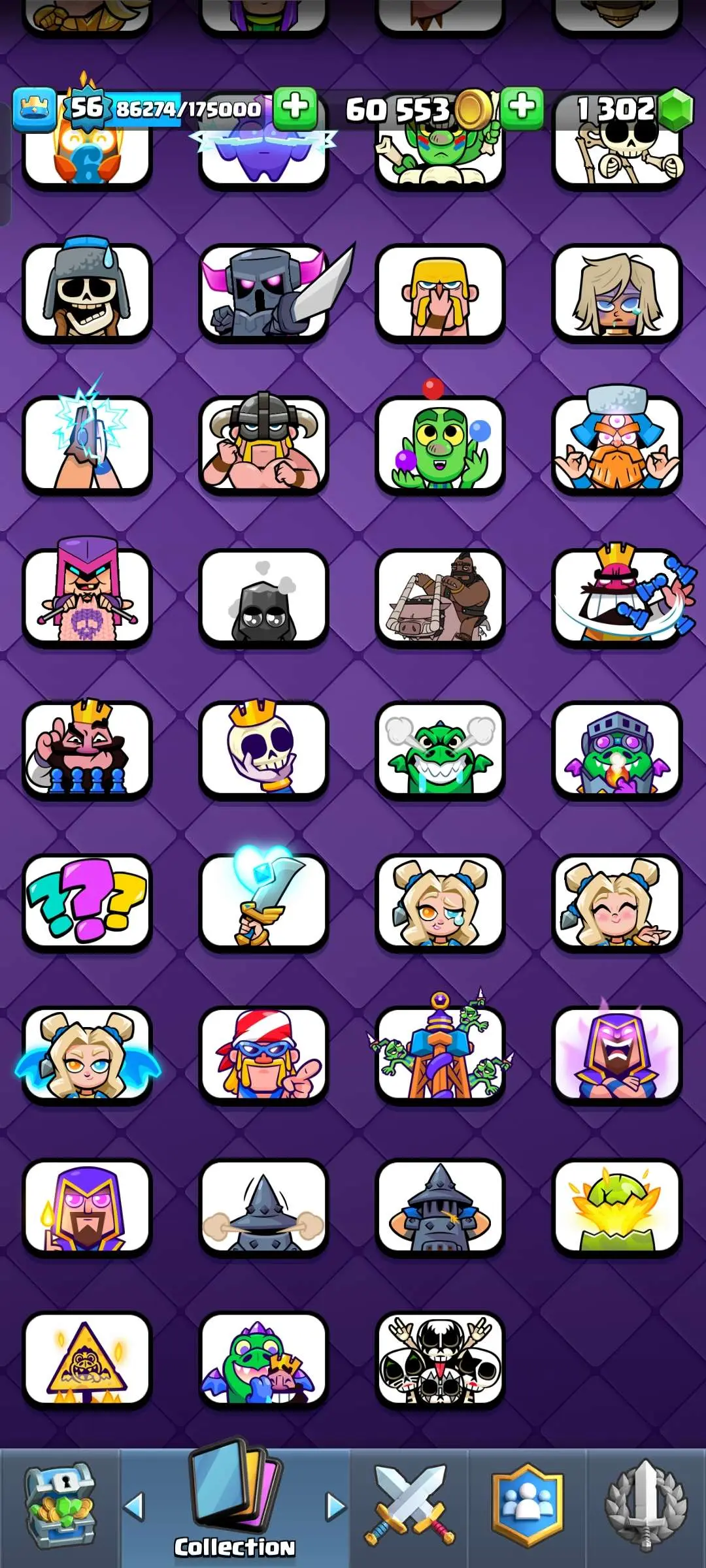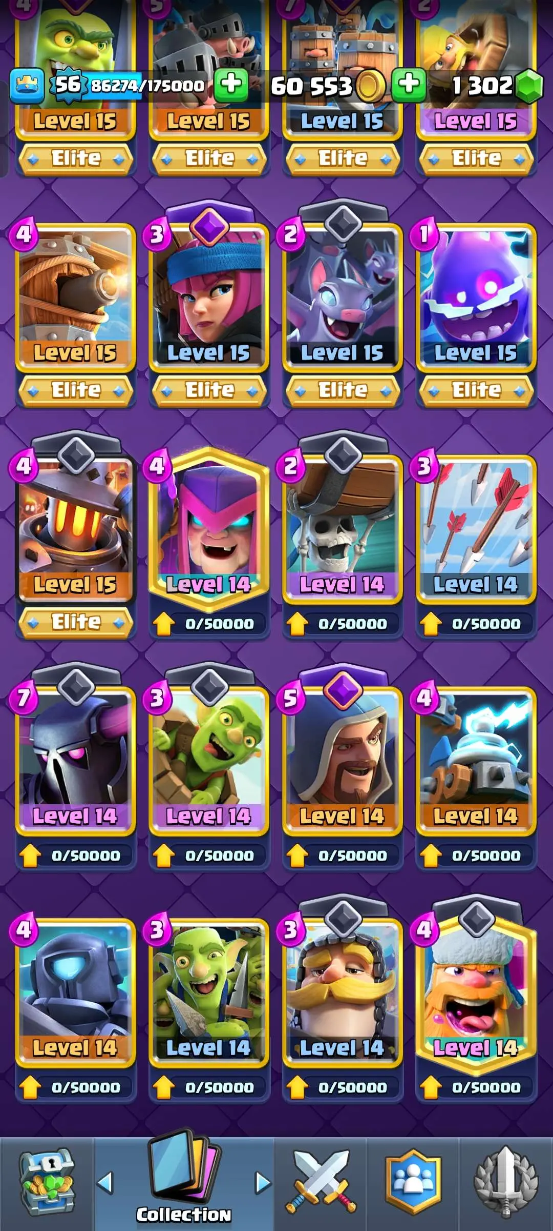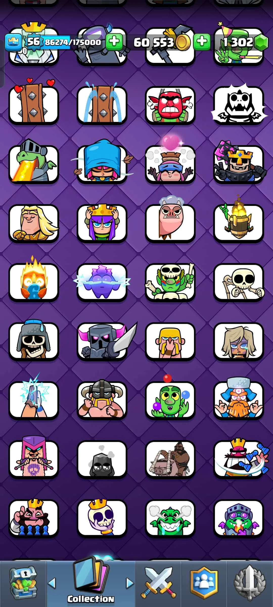 CR Lvl 56 ✨ 15000 Trophy ✨ Grand champion✨ KT 15 ✨ 9 Elite Cards ✨ 55 Max Cards ✨ 9 Evo Cards ✨ 104 Emotes ✨ 6 Tower