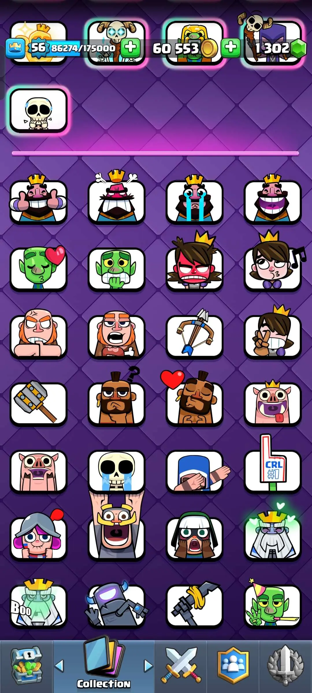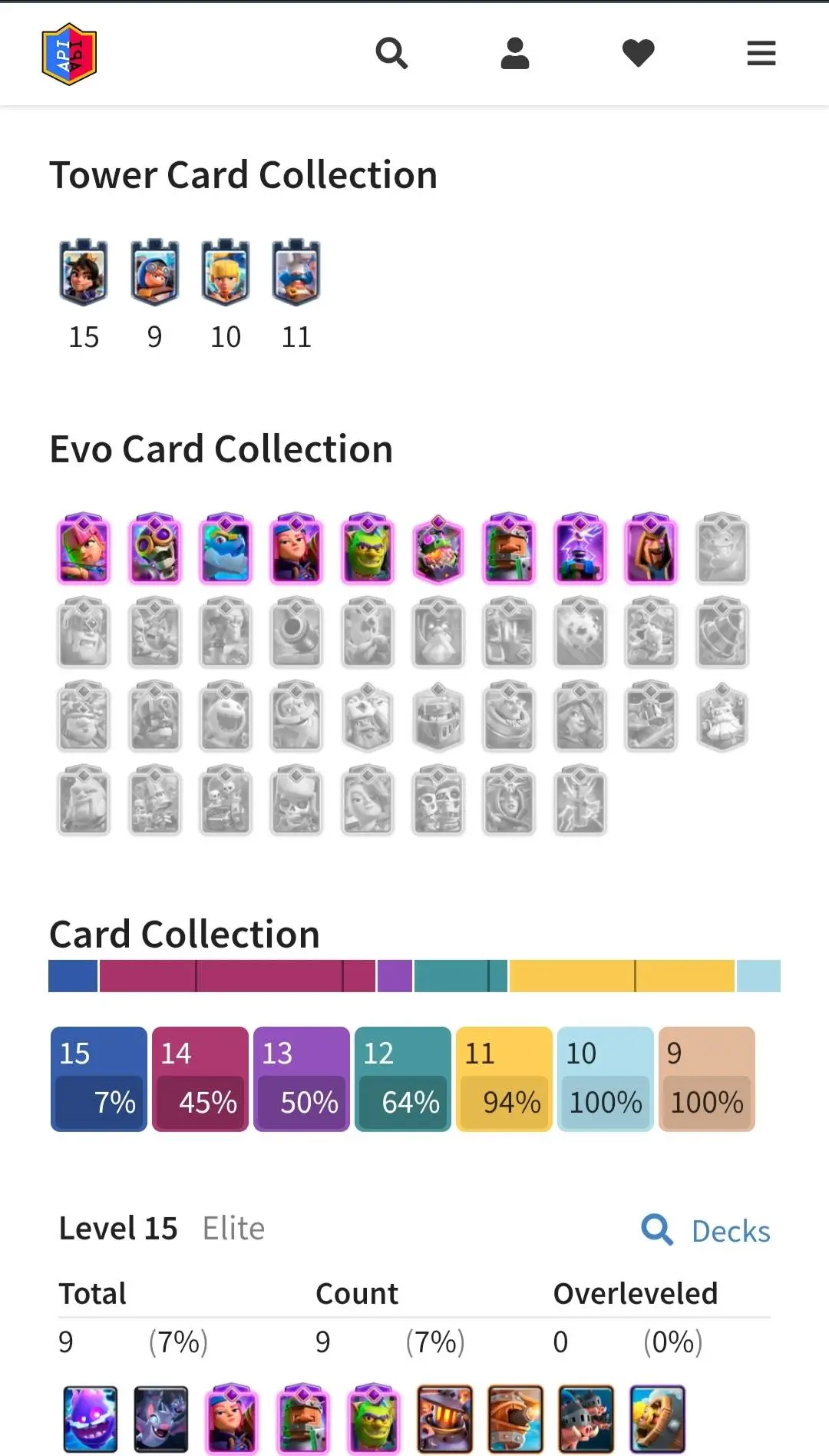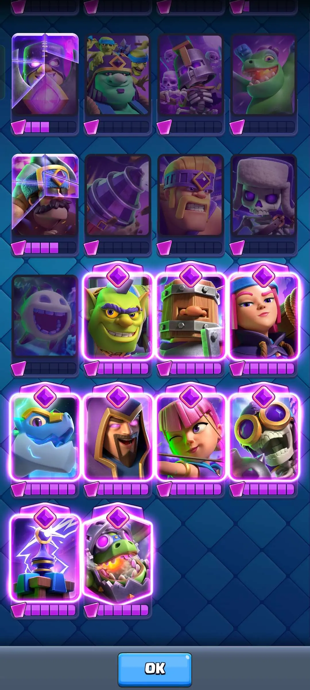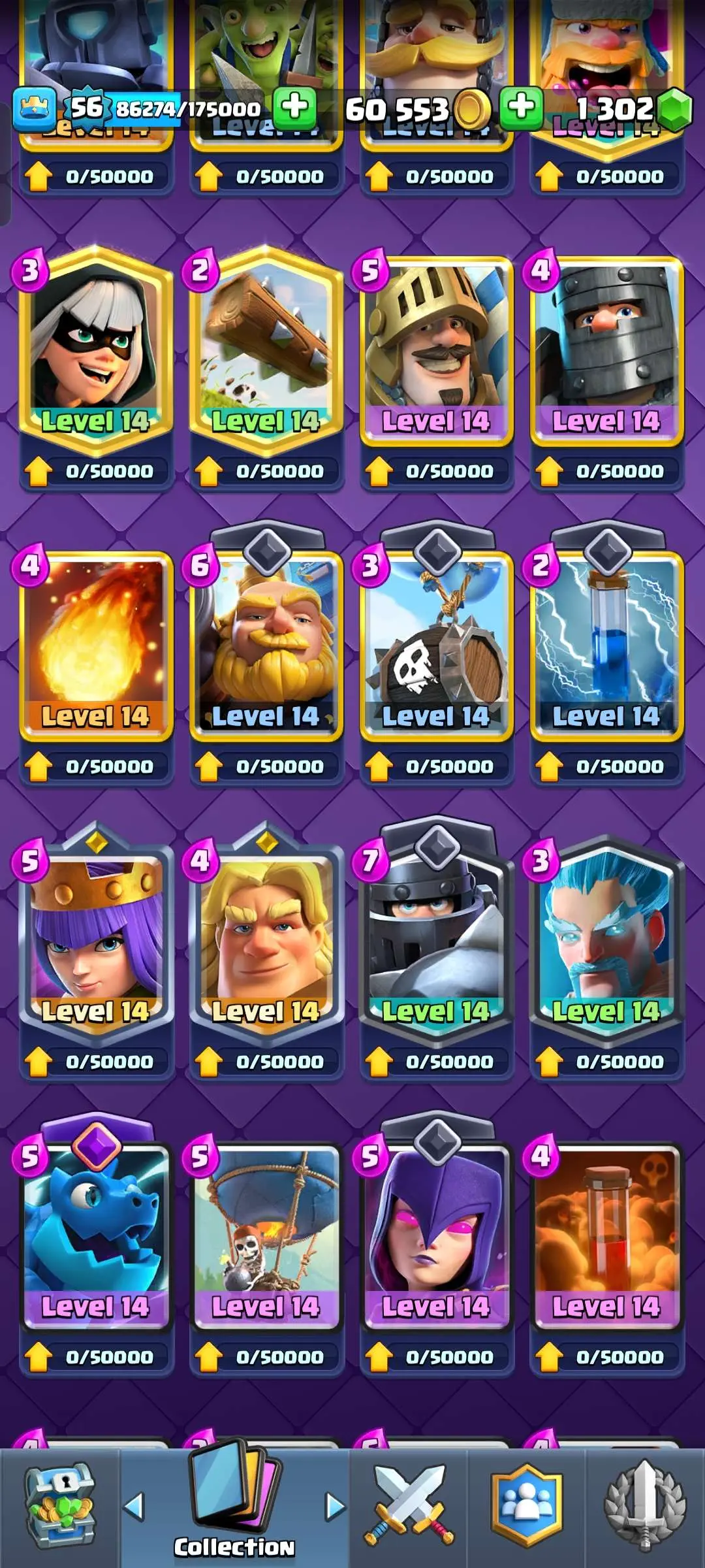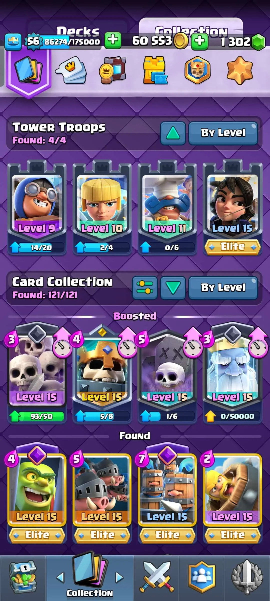 CR Lvl 56 ✨ 15000 Trophy ✨ Grand champion✨ KT 15 ✨ 9 Elite Cards ✨ 55 Max Cards ✨ 9 Evo Cards ✨ 104 Emotes ✨ 6 Tower