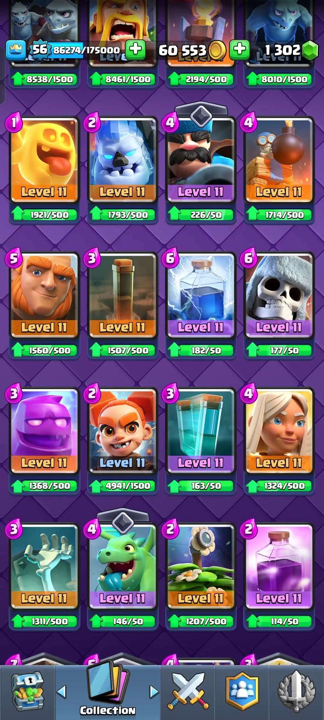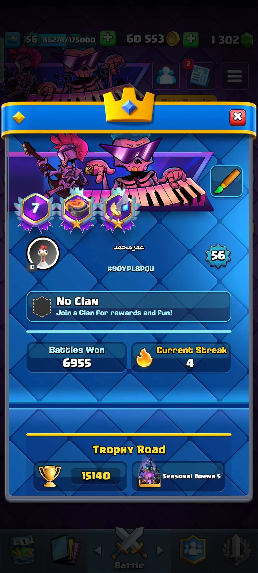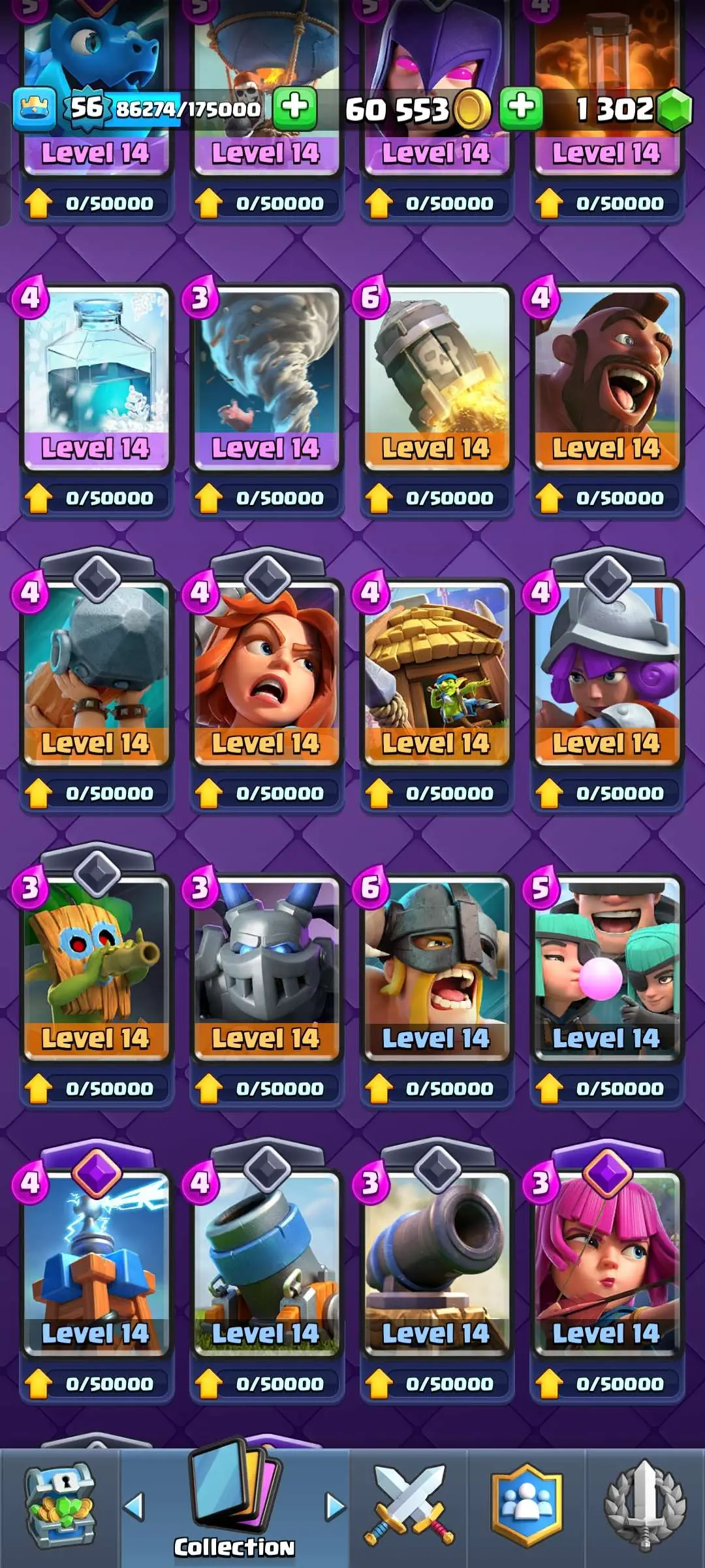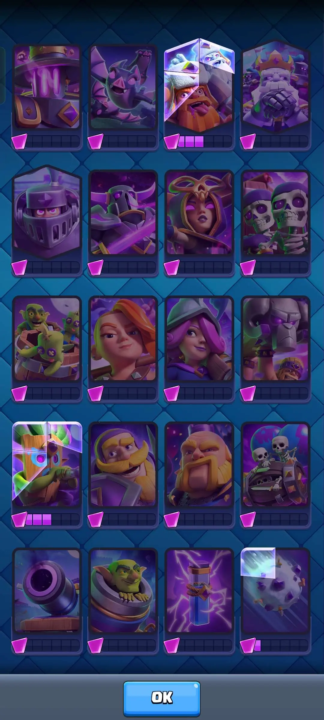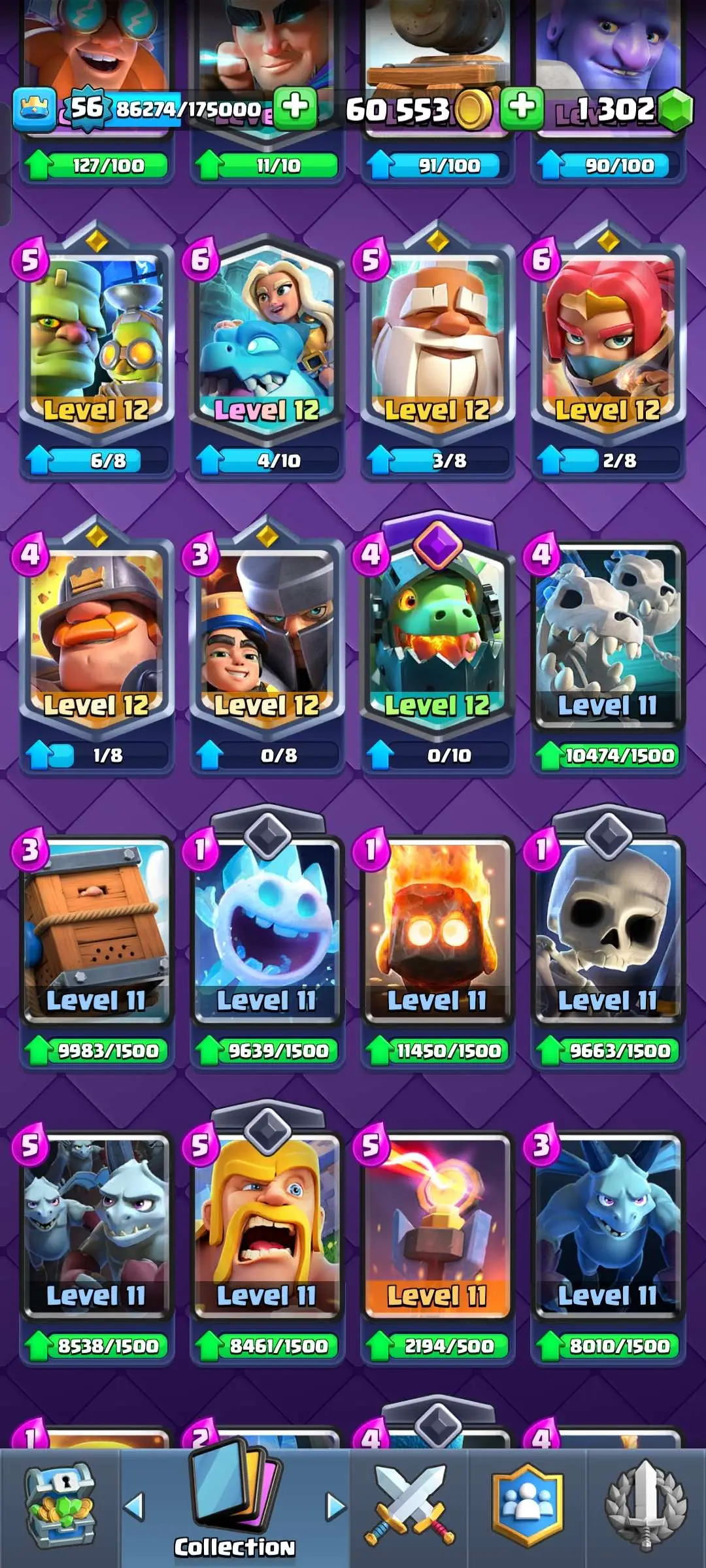 CR Lvl 56 ✨ 15000 Trophy ✨ Grand champion✨ KT 15 ✨ 9 Elite Cards ✨ 55 Max Cards ✨ 9 Evo Cards ✨ 104 Emotes ✨ 6 Tower