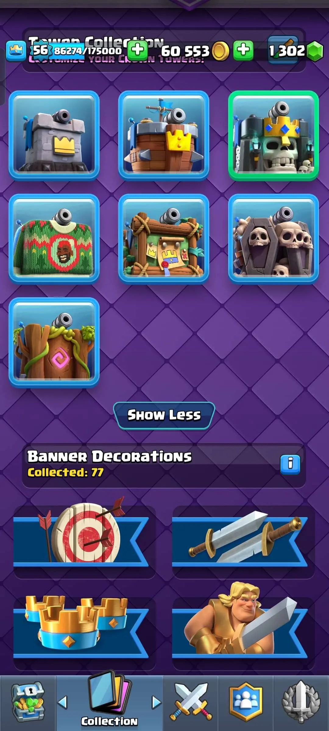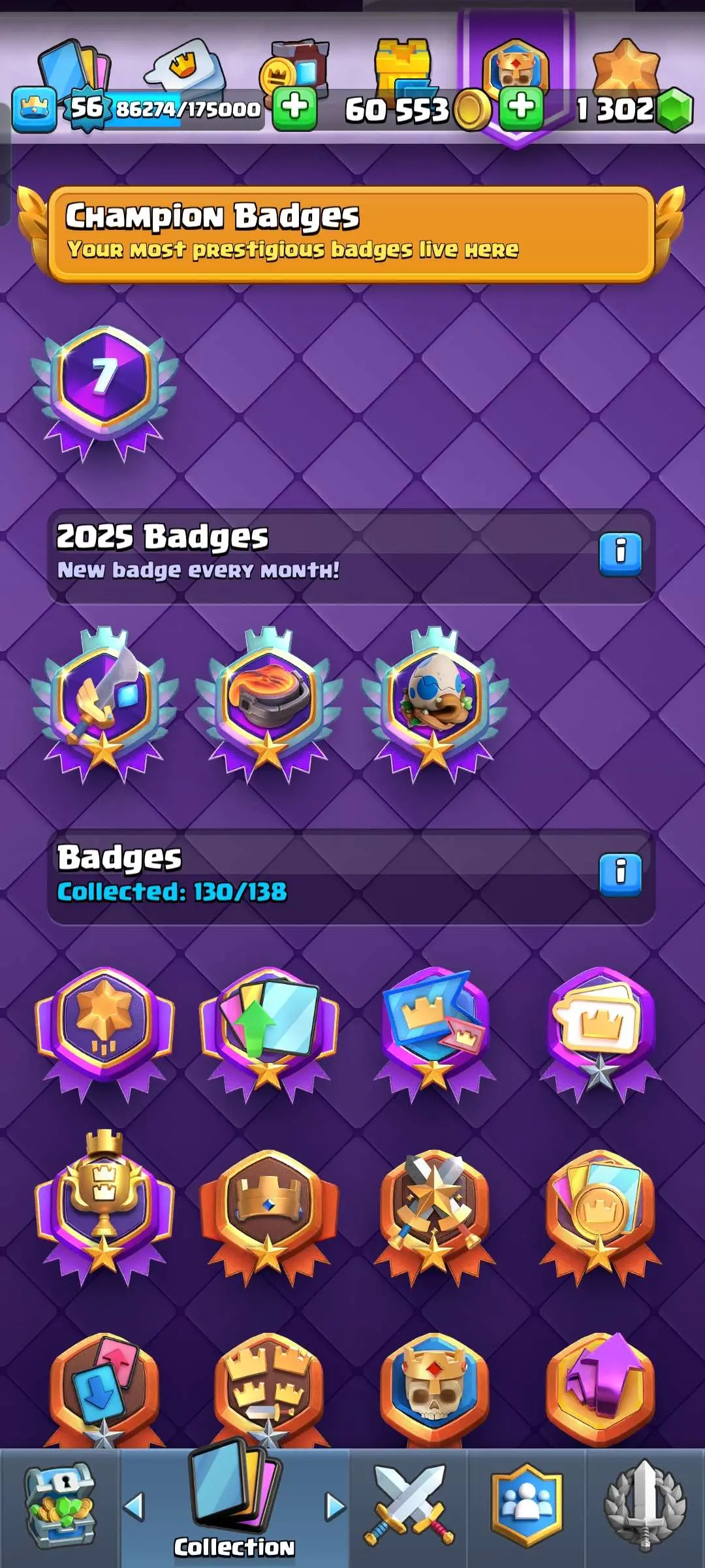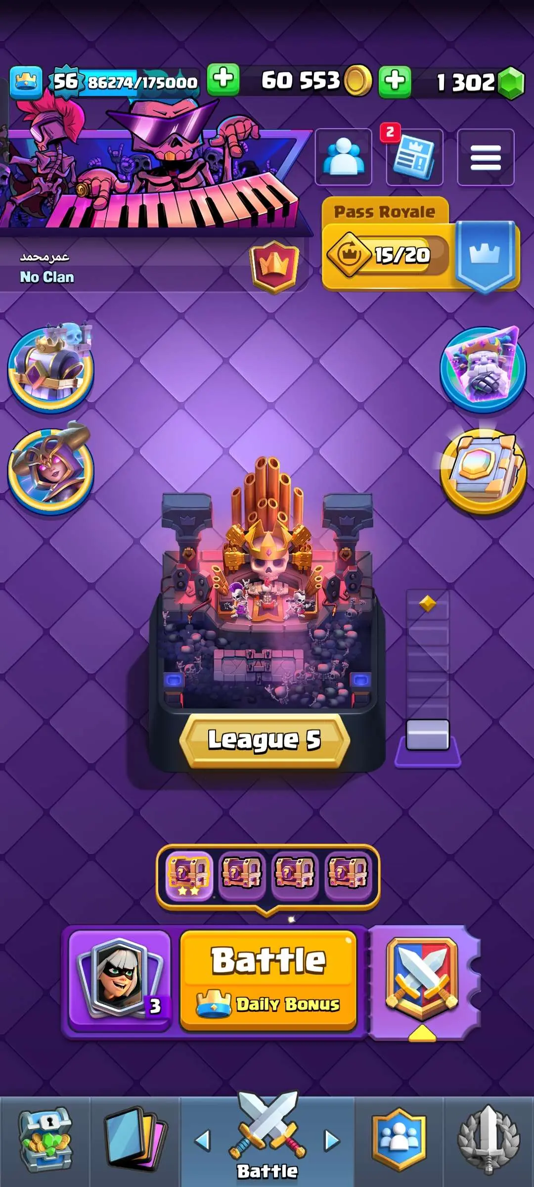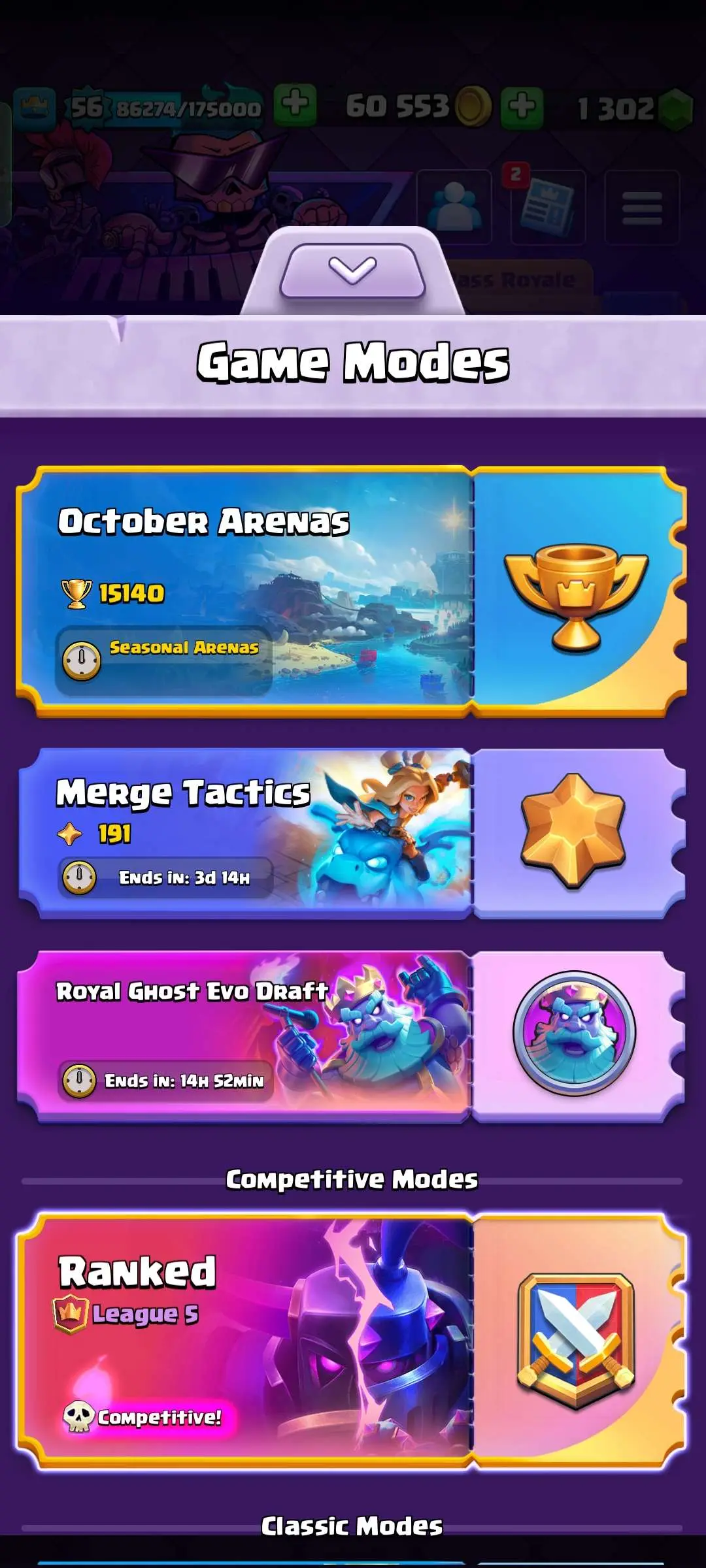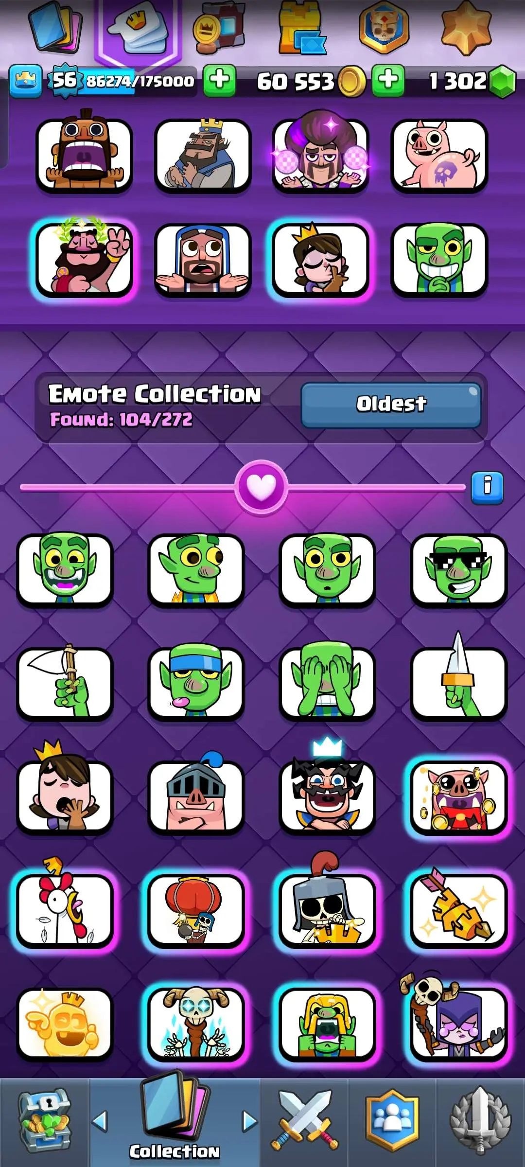 CR Lvl 56 ✨ 15000 Trophy ✨ Grand champion✨ KT 15 ✨ 9 Elite Cards ✨ 55 Max Cards ✨ 9 Evo Cards ✨ 104 Emotes ✨ 6 Tower