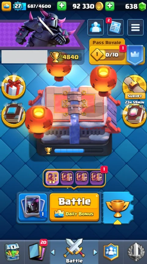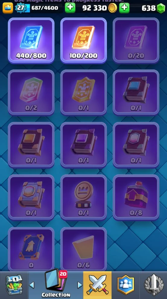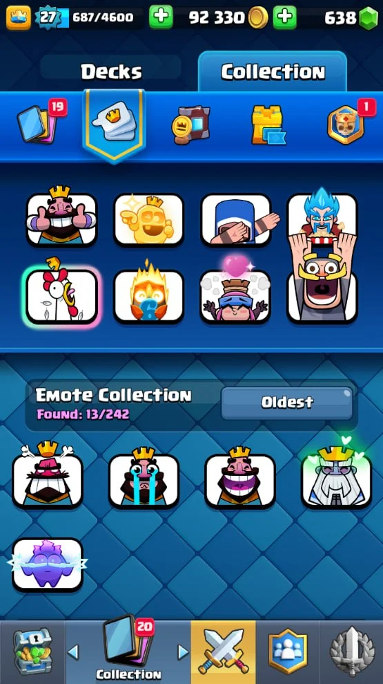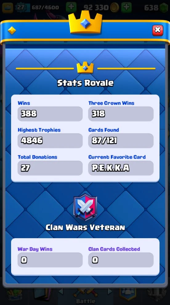 👑 KT 10 👑 4840 Trophy 👑 27 LVL 👑 87 Cards 👑 13 Emotes 👑 638 Gems 👑 92 k Gold 👑 + Clash of Clans TH 9 👑