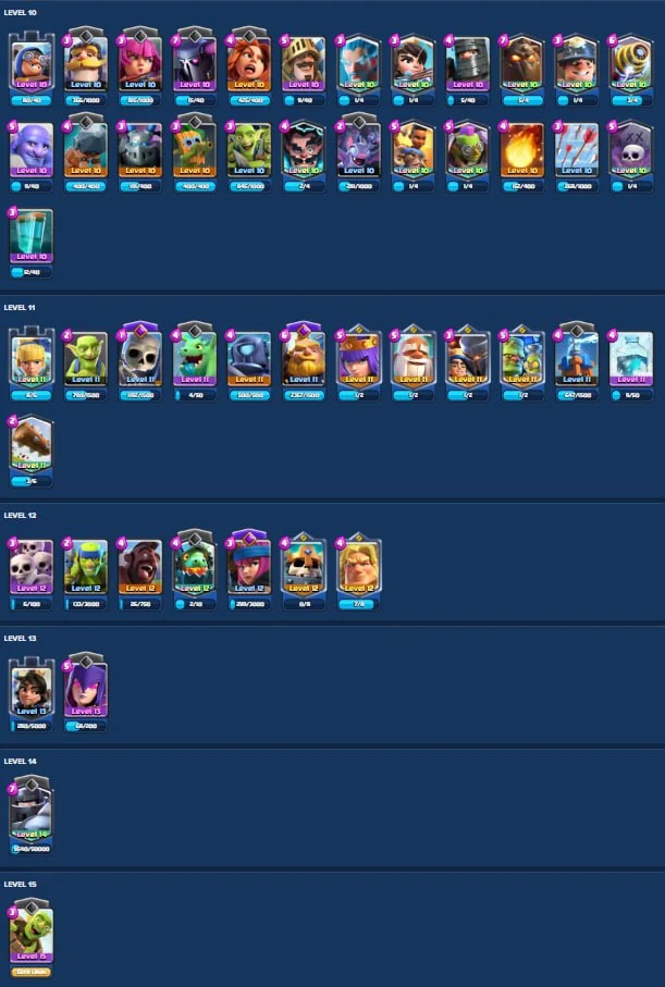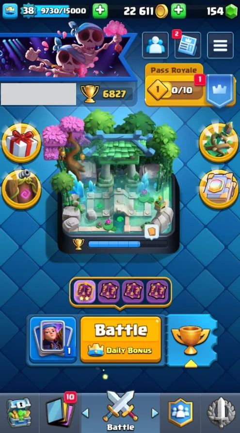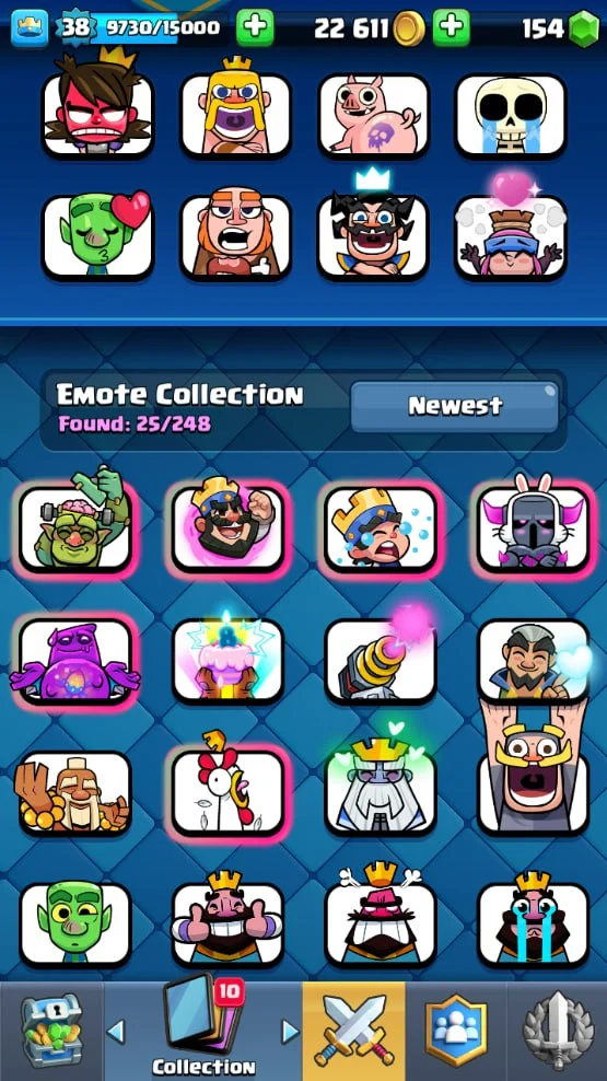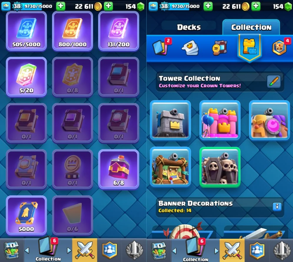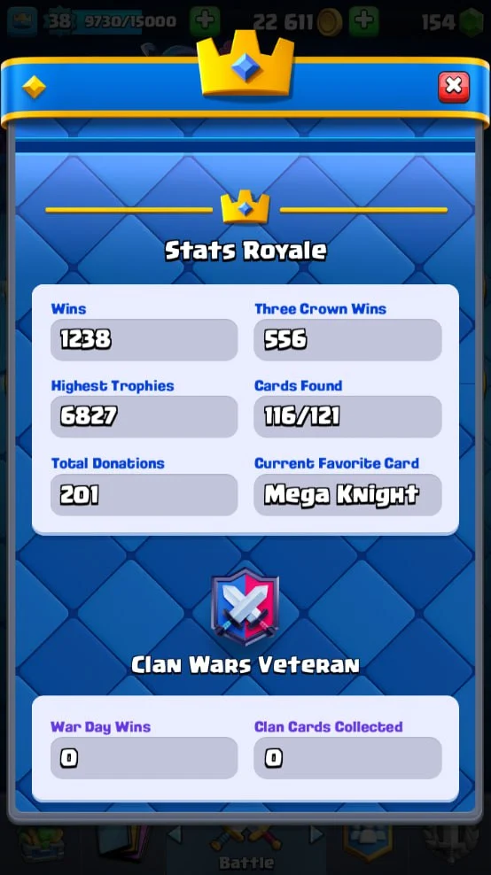 👑 KT 13 👑 6827 Trophy 👑 38 LVL 👑 116 Cards 👑 25 Emotes 👑 154 Gems 👑 22 k Gold 👑