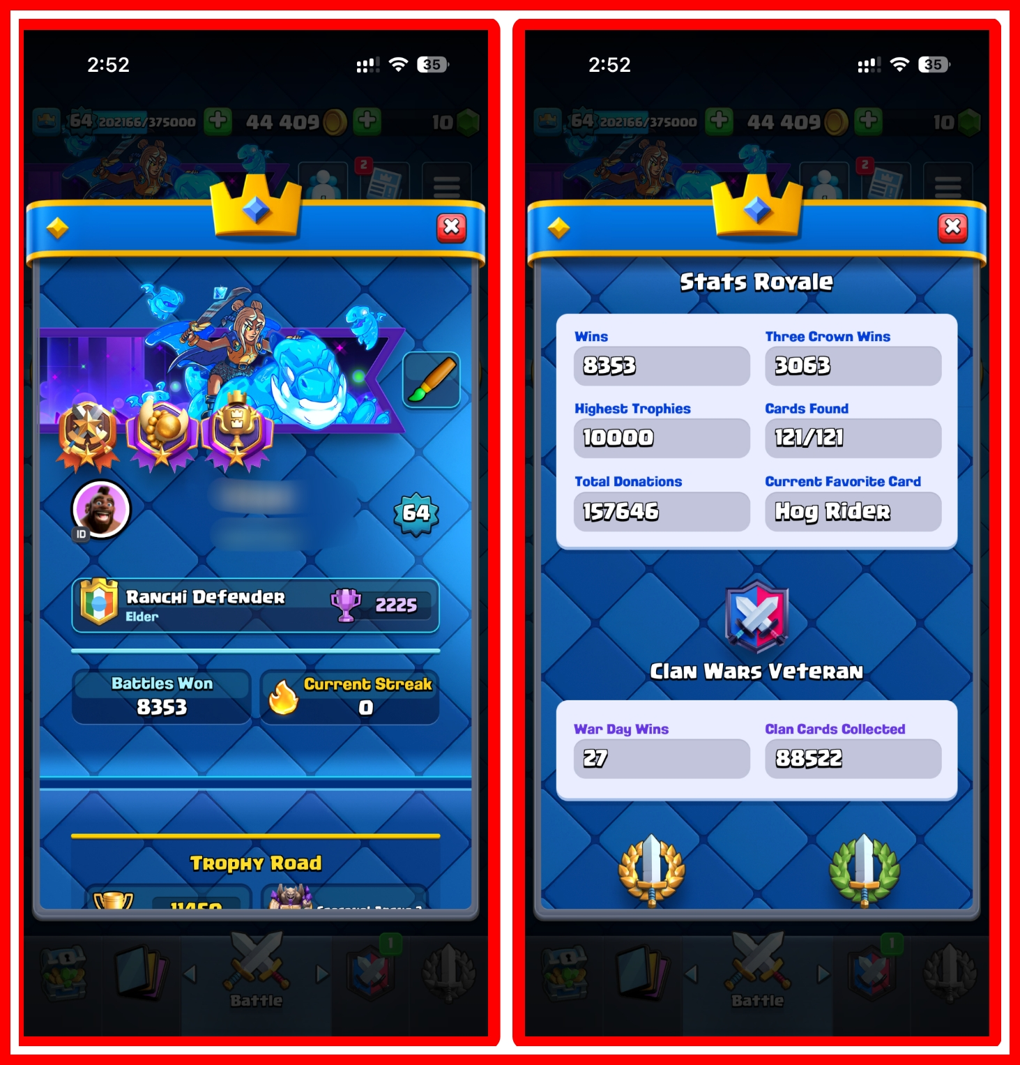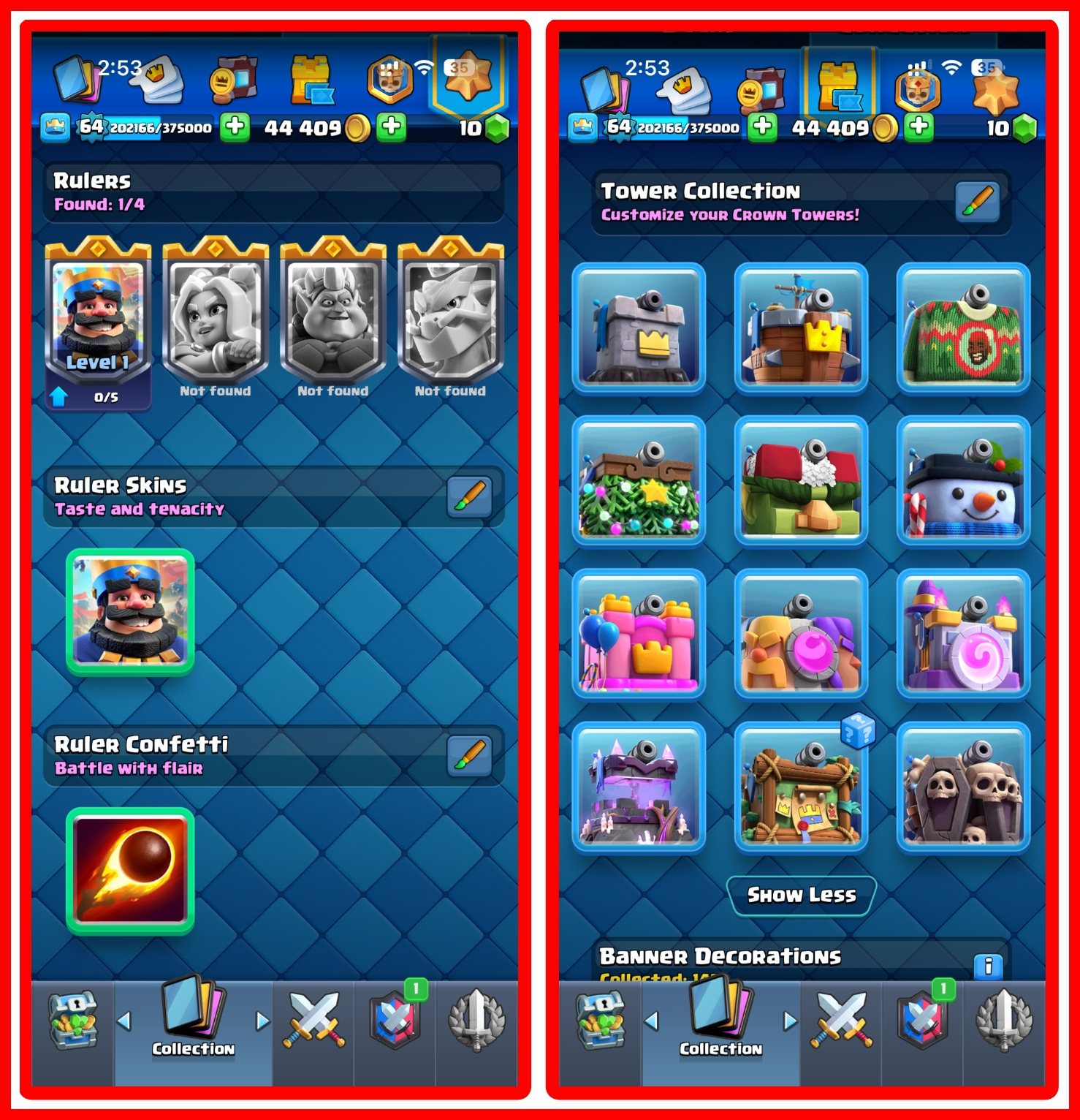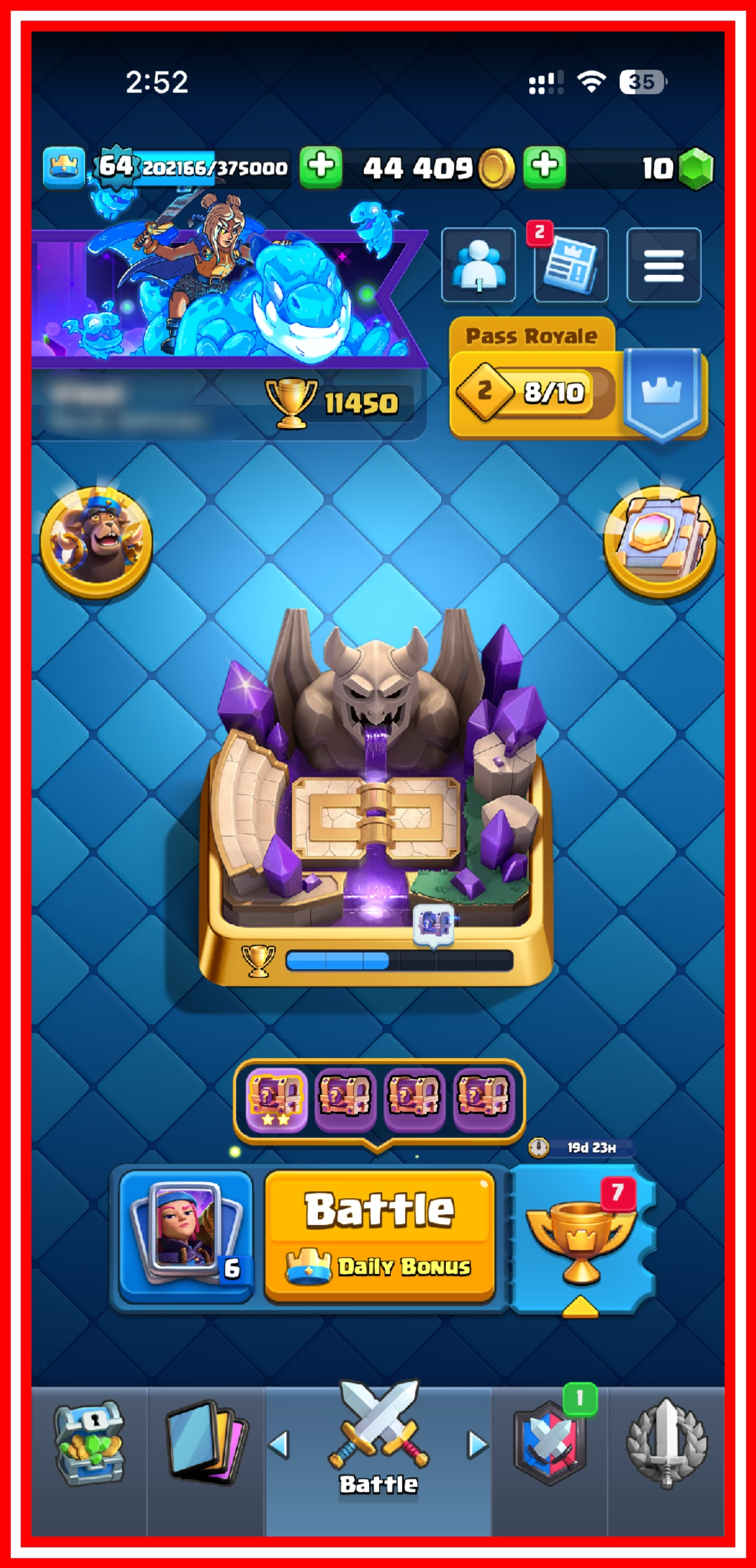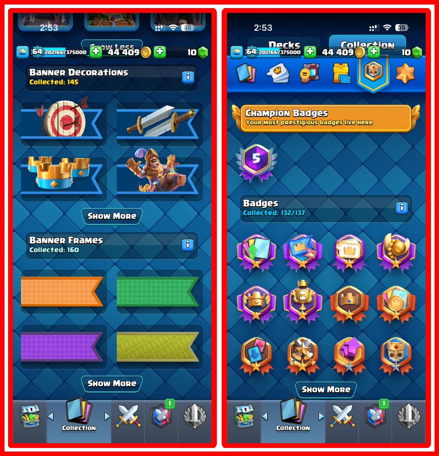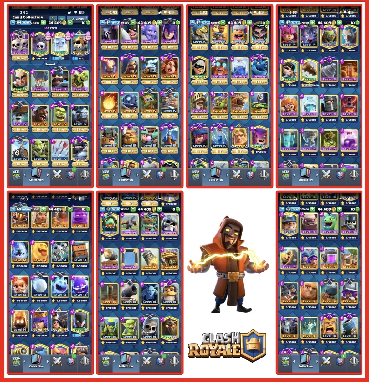 KT ⸱ 15 ⚡️Exp ⸱ 64 ⚡️11k Trophies 🏆 5 Year old 😱109 Max Cards 🔥44 Elite 🔥17 Evo 🔥216 Emotes 😱132 Badges 😍160 Frames 💎121/121 Cards 🤩Instant Delivery