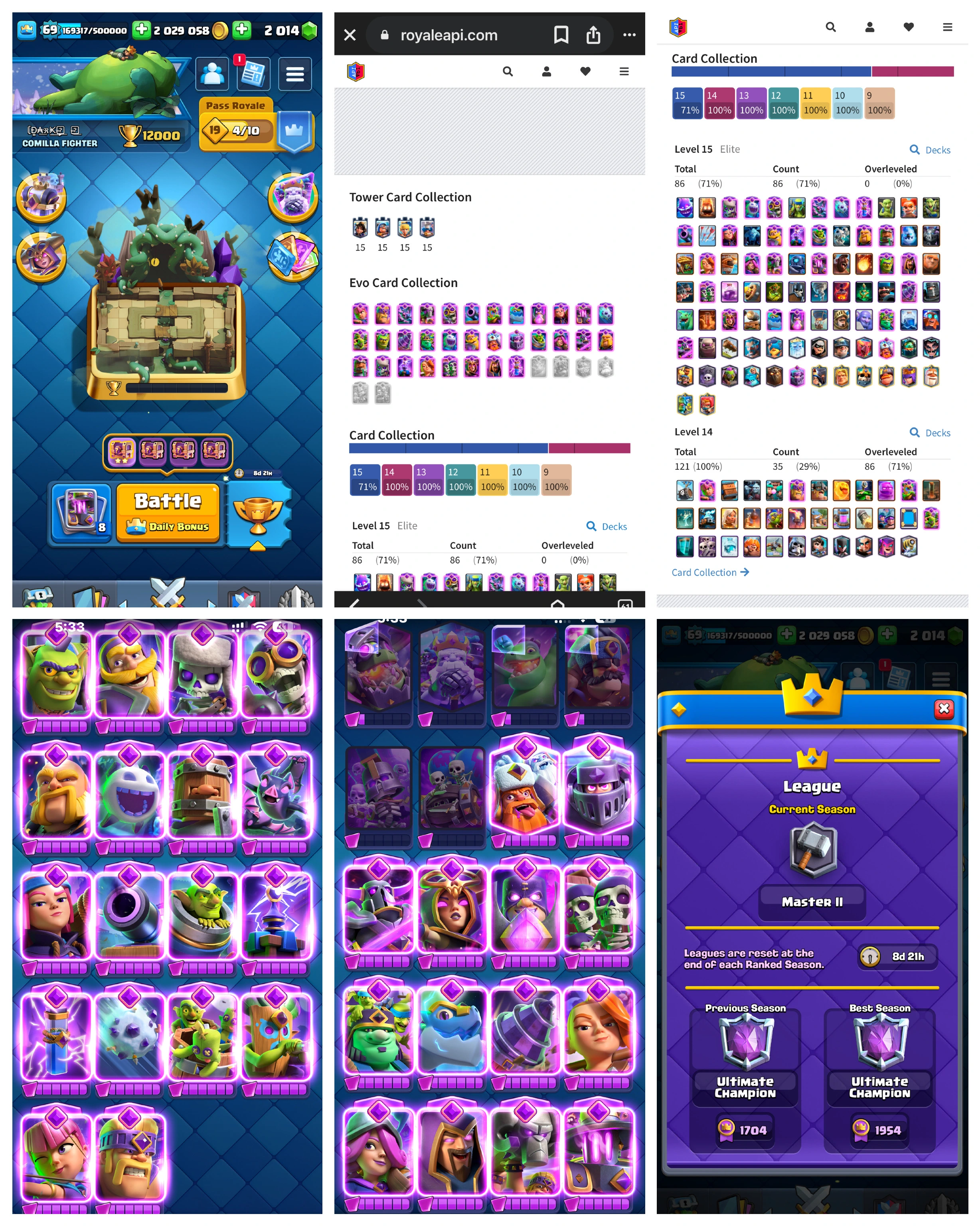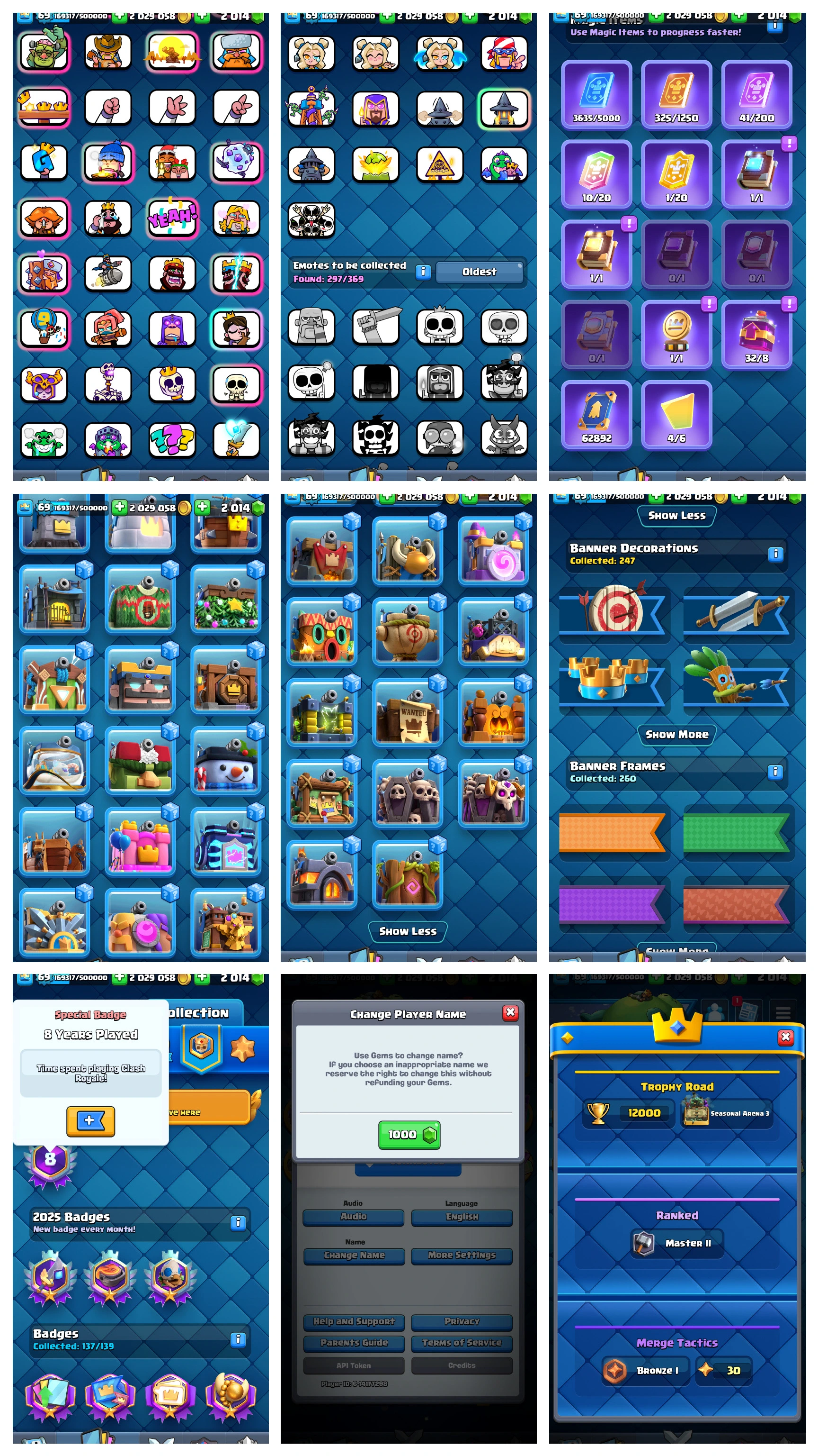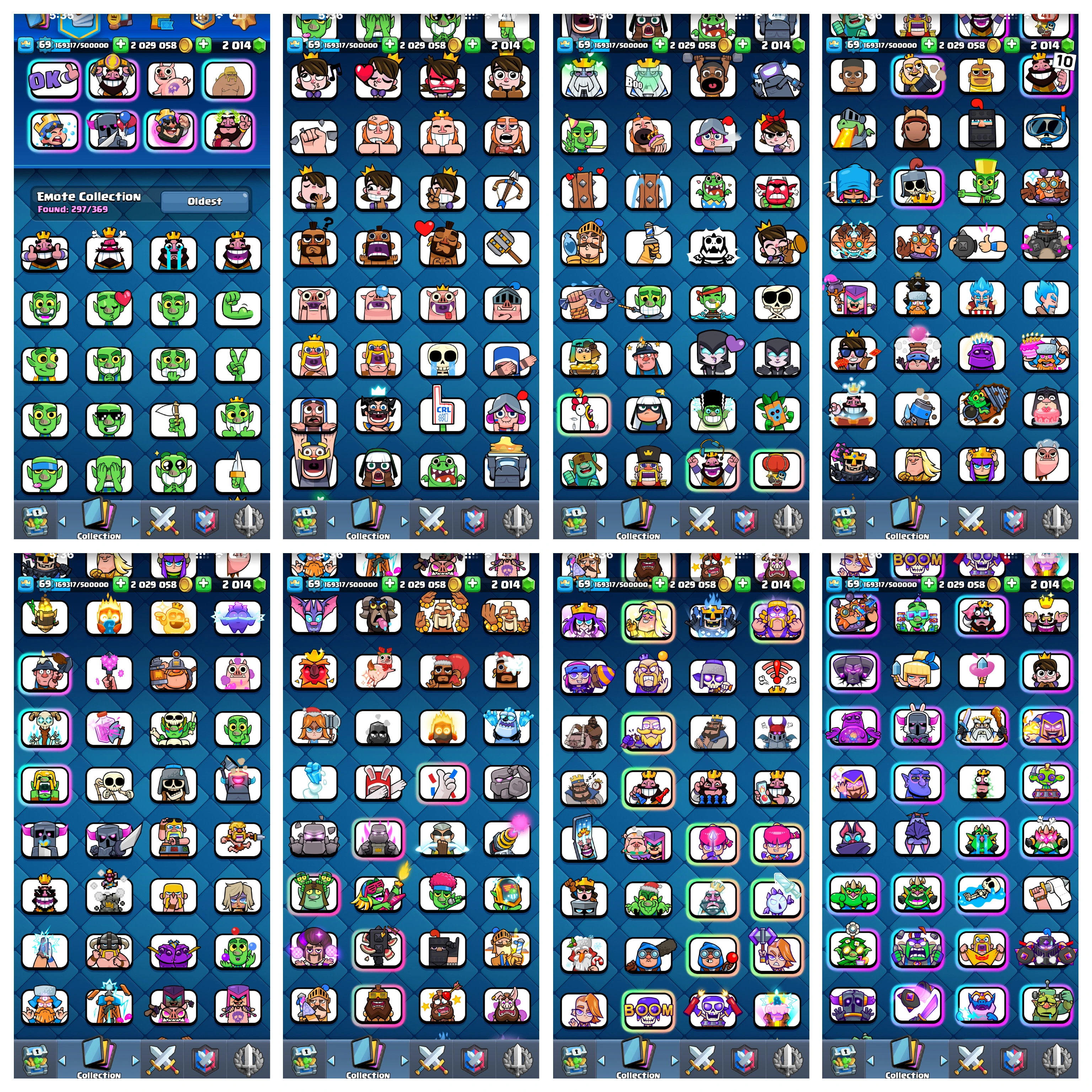 KT 15 (LVL.69)✅ EVO-32 ✅ 91 ELITE CARDS ✅ ALL CARD MAX ✅ TOWER SKINS-32 ✅ EMOTES-297 (SOME RAREST EMOTES)✅ 12K TROPHY ✅ ULTIMATE CHAMPION 1954 ✅ 2M GOLD & 2K GEMS ✅ ANDROID & IOS