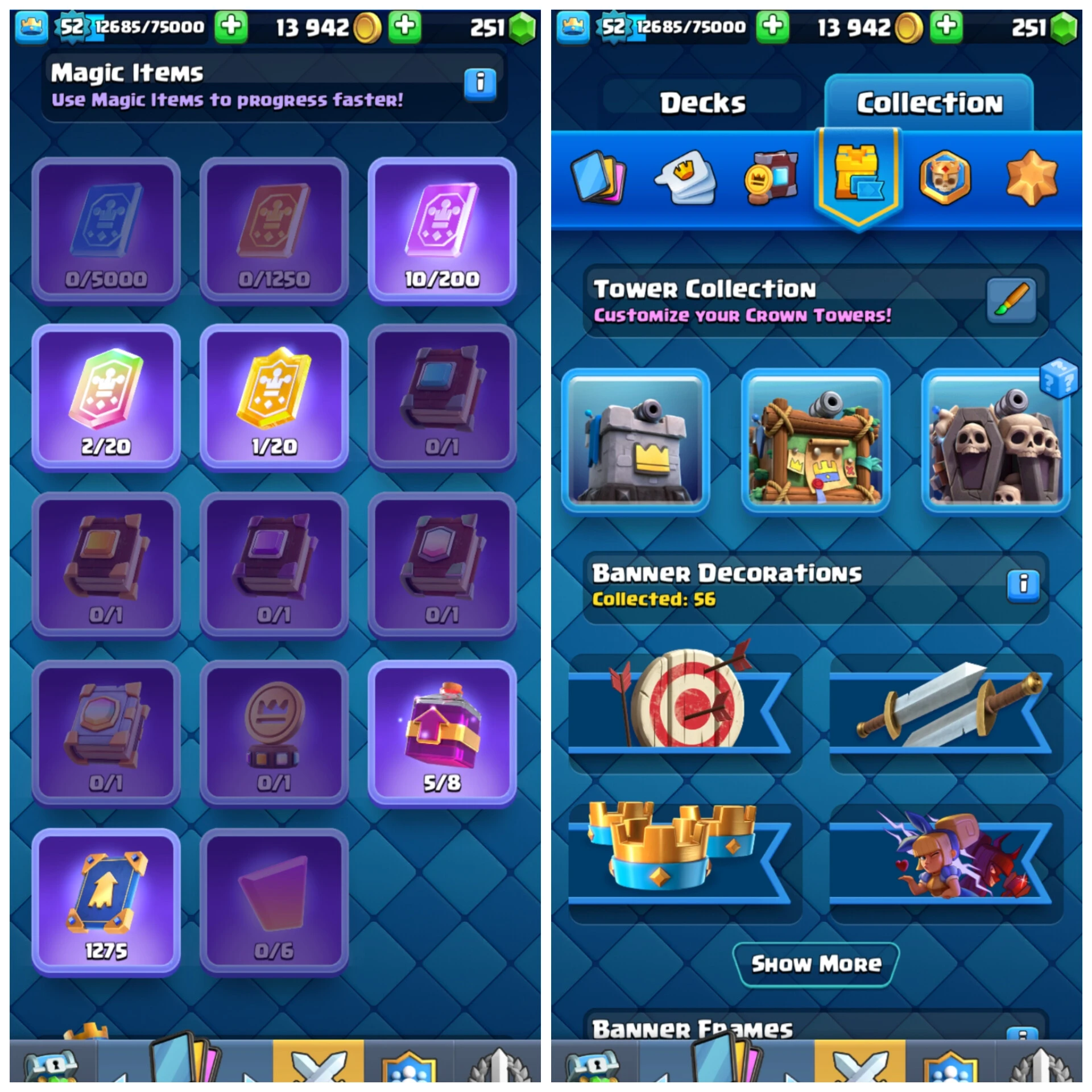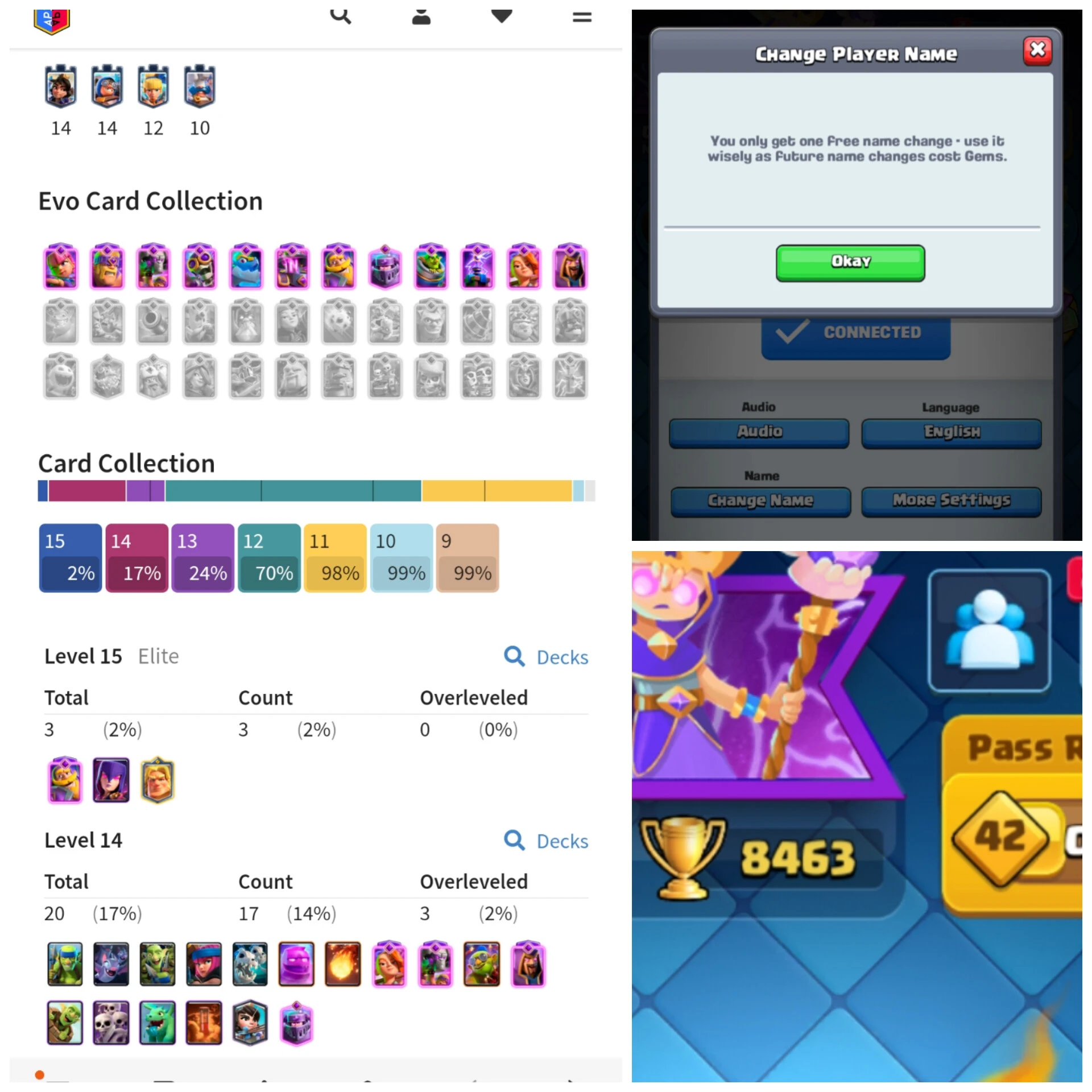 KT14(52)+3 Elite & 20 max+ 12 EVOLUTION + 2 skins tower + 251 Gems + 76 Emotes + 8463 Trohpies + free change name <Safe & cheap> ANDROID/IOS