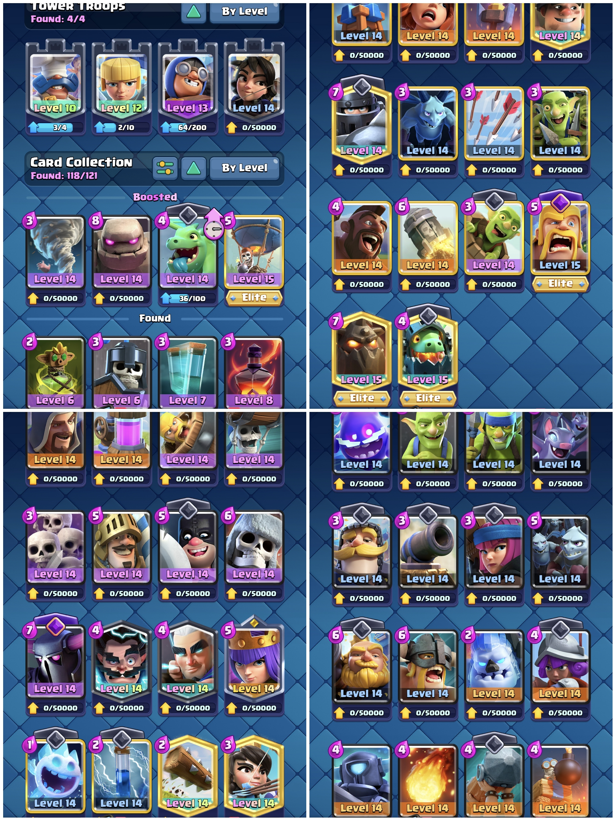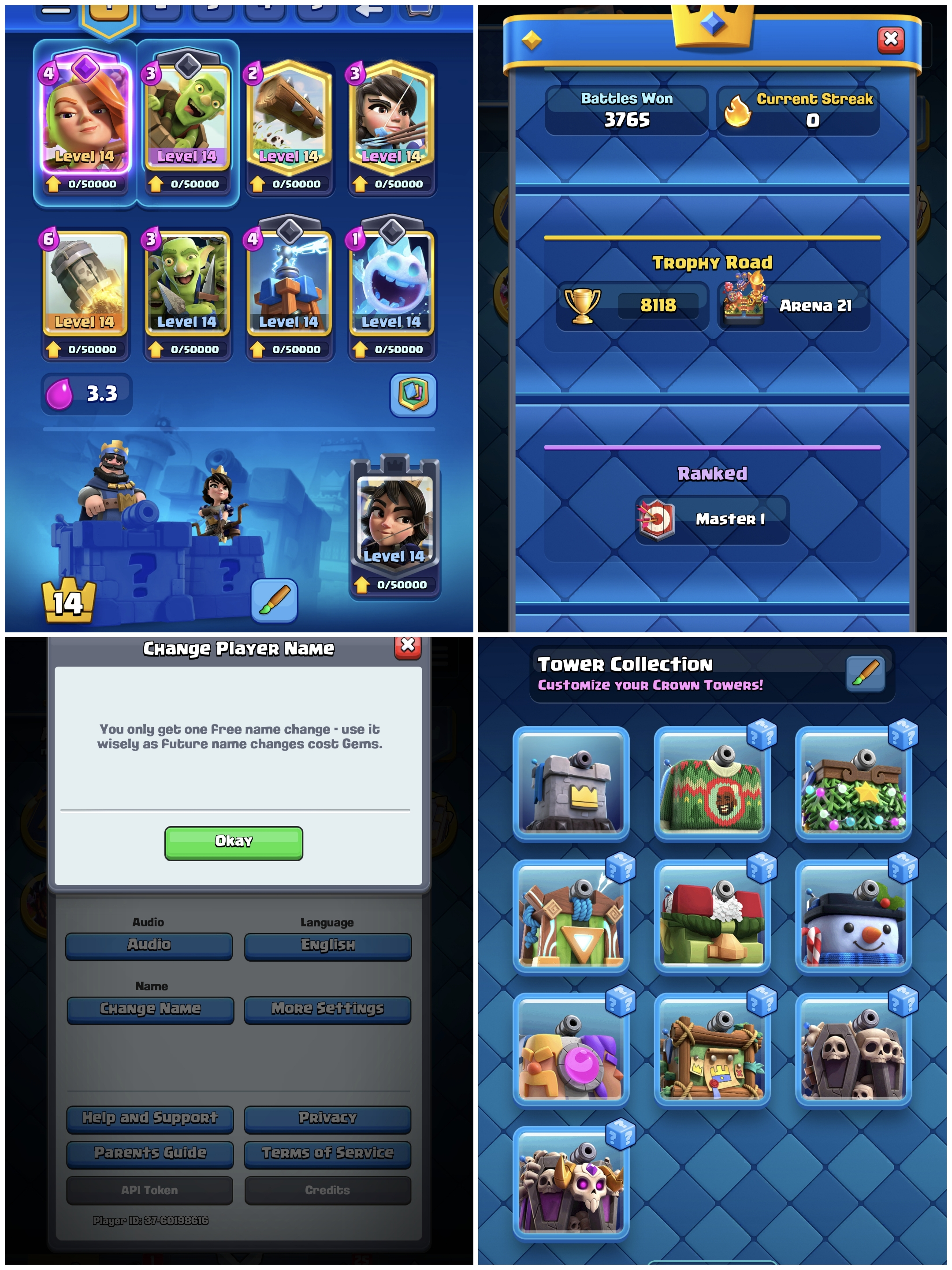 ✨[PREMIUM]✨ [MEGA ACCOUNT]🔥 8100 TROPHIES🏆 50 MAX CARDS ( 4 ELITE ) ⭐ KT 14 🚀 XP 53 🌟 ARENA 21 🏰 9 EXTRA TOWER SKINS 💠 IOS AND ANDROID WORKING 🔐 INSTANT DELIVERY 🚚