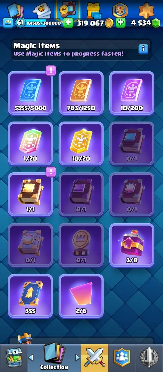 🏆 SEASONAL ARENA 2 ⭕️ LVL 61 KING | KT15 ⭕️ 11,050PB ⭕️ 95 MAX | 29 ELITE | 16 EVO 🃏 ⭕️ 319K GOLD 💰 4,534 GEMS 💎 ⭕️ 92 EMOTES (RARES INCLUDED) 🎭 ⭕️ 🏰 11 TOWER SKINS ⭕️ 🎖 8-YEAR BADGE ⭕️ 📚 STACKED MAGIC ITEMS ⭕️ ⚡ INSTANT DELIVERY