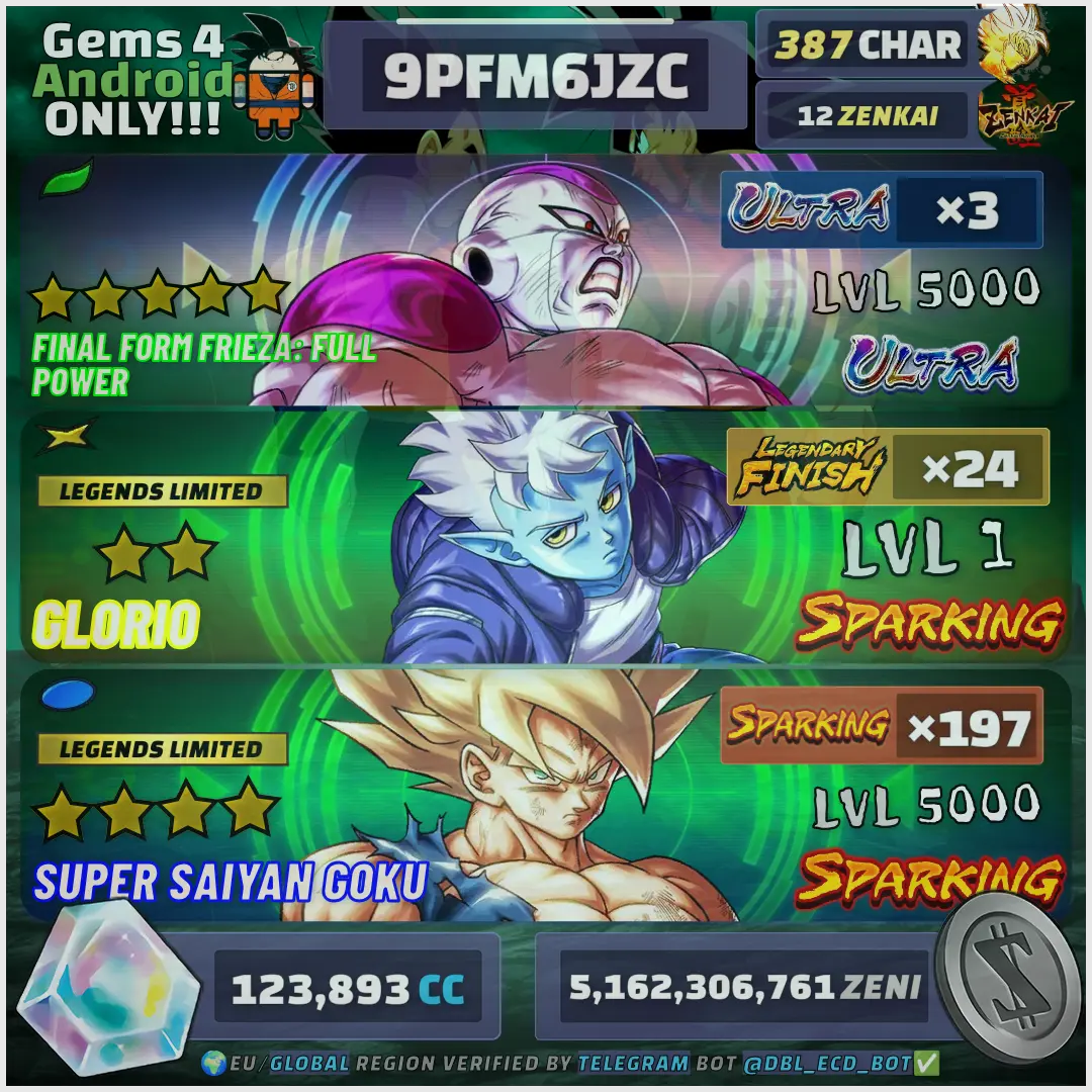 ⚡ INSANE DBL Package: [📱 Platform: Android, 👤 Characters: 387, 🌟 Ultra: 3, ⚔️ Sparking: 197, 💎 Crystals: 123893, 👑 Limited: 24, ⚡ Zenkai: 12] ⸱ GODLY BOX | LIMITED TIME !AGG02522