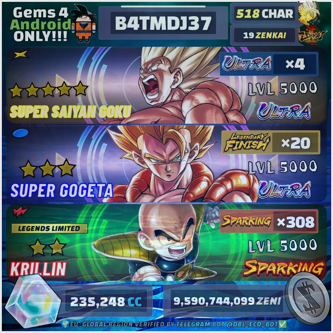 ⚡ INSANE DBL Package: [📱 Platform: Android, 👤 Characters: 514, 🌟 Ultra: 4, ⚔️ Sparking: 304, 💎 Crystals: 235248, 👑 Limited: 18, ⚡ Zenkai: 18] ⸱ GODLY BOX | LIMITED TIME !AGG02422