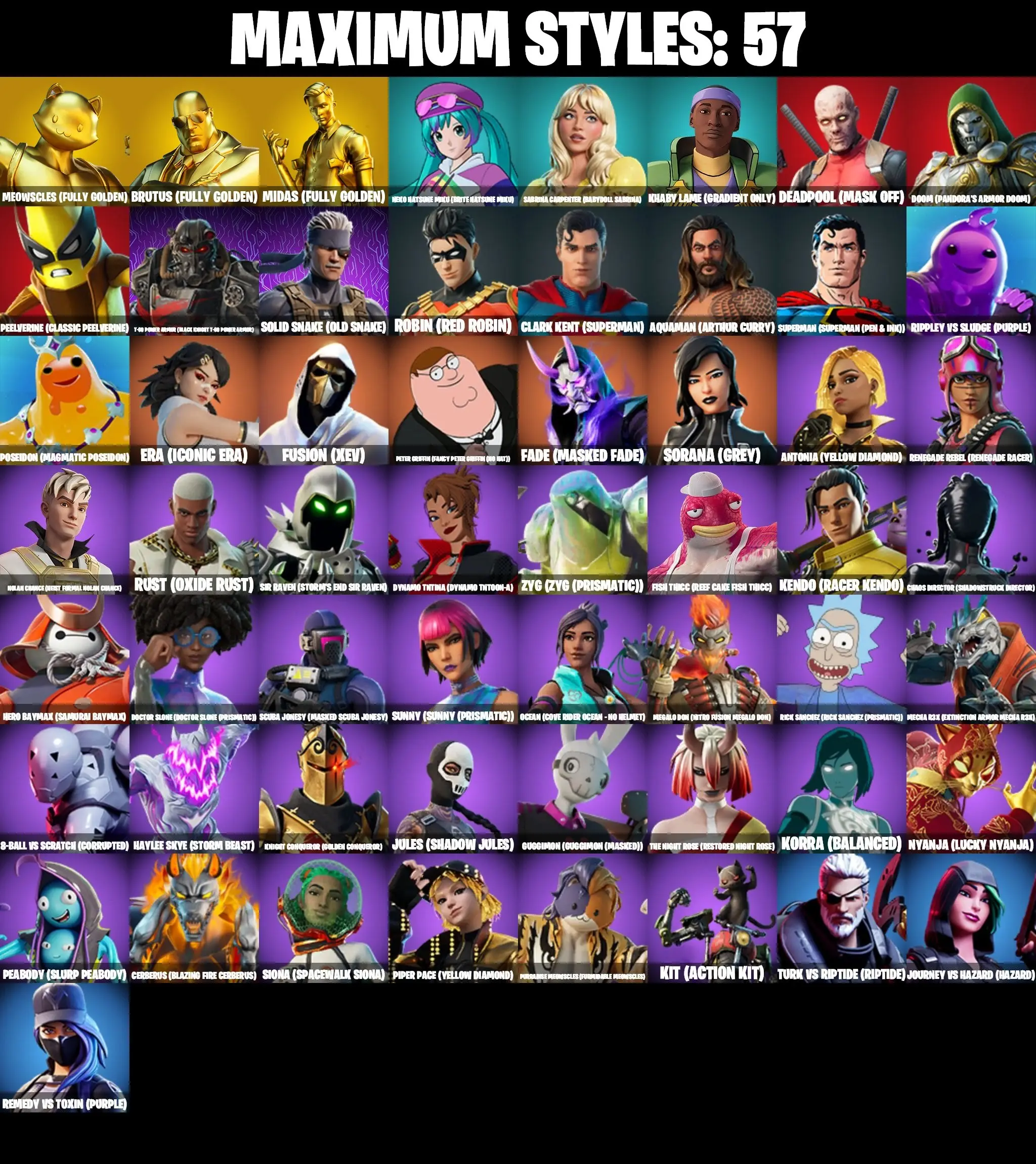 178 SKINS | CAMMY | MANDALORIAN | RUSHIN AROUND | SPIDER-MAN | GENERAL GRIEVOUS | AHSOKA TANO | APPRENTICE EVIE | EMPEROR PALPATINE | WOOKIE TEAM LEADER | POE DAMERON | SUB-ZERO MK3 | OUTLAW MIDAS | ERA MAX | CHAOS DIRECTOR MAX |
